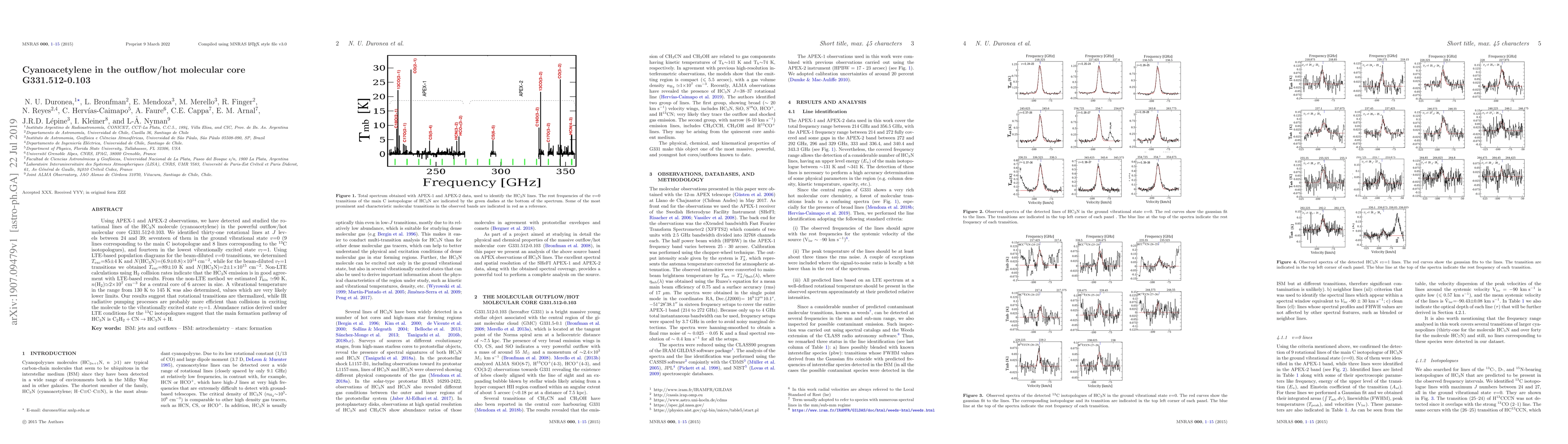 Using APEX-1 and APEX-2 observations, we have detected and studied the rotational lines of the HC$_3$N molecule (cyanoacetylene) in the powerful outflow/hot molecular core G331.512-0.103. We identified thirty-one rotational lines at $J$ levels between 24 and 39; seventeen of them in the ground vibrational state $v$=0 (9 lines corresponding to the main C isotopologue and 8 lines corresponding to the $^{13}$C isotopologues), and fourteen in the lowest vibrationally excited state $v_7$=1. Using LTE-based population diagrams for the beam-diluted $v$=0 transitions, we determined $T_{\rm exc}$=85$\pm$4 K and $N$(HC$_3$N)=(6.9$\pm$0.8)$\times$10$^{14}$ cm$^{-2}$, while for the beam-diluted $v_7$=1 transitions we obtained $T_{\rm exc}$=89$\pm$10 K and $N$(HC$_3$N)=2$\pm$1$\times$10$^{15}$ cm$^{-2}$. Non-LTE calculations using H$_2$ collision rates indicate that the HC$_3$N emission is in good agreement with LTE-based results. From the non-LTE method we estimated $T_{\rm kin}$ $\simeq$90~K, $n$(H$_2$)$\simeq$2$\times$10$^7$~cm$^{-3}$ for a central core of 6 arcsec in size. A vibrational temperature in the range from 130~K to 145~K was also determined, values which are very likely lower limits. Our results suggest that rotational transitions are thermalized, while IR radiative pumping processes are probably more efficient than collisions in exciting the molecule to the vibrationally excited state $v_7$=1. Abundance ratios derived under LTE conditions for the $^{13}$C isotopologues suggest that the main formation pathway of HC$_3$N is ${\rm C}_2{\rm H}_2 + {\rm CN} \rightarrow {\rm HC}_3{\rm N} + {\rm H}$.