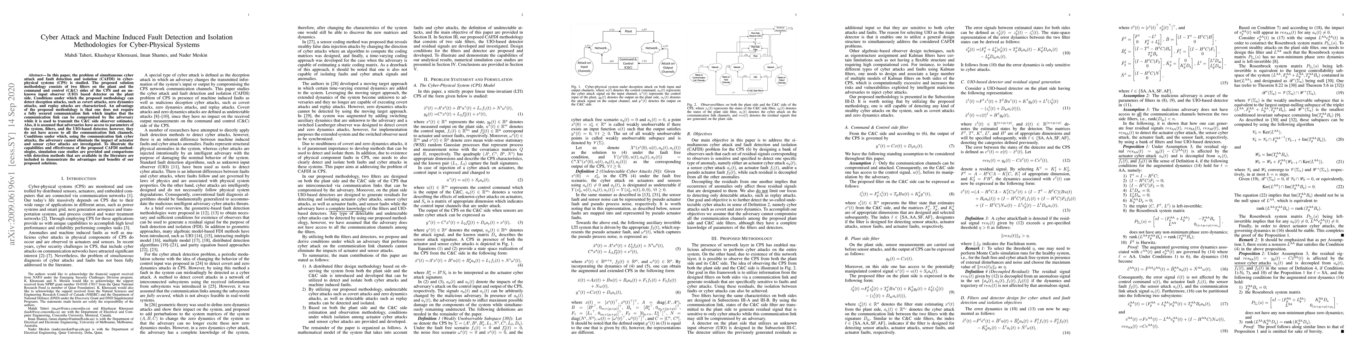 This paper proposes a dual-filter and unknown input observer-based methodology for detecting and isolating cyber attacks and faults in cyber-physical systems, demonstrating effective detection of various attack types without requiring a fully secured communication link. Simulation results show the proposed method's advantages over existing detection techniques.