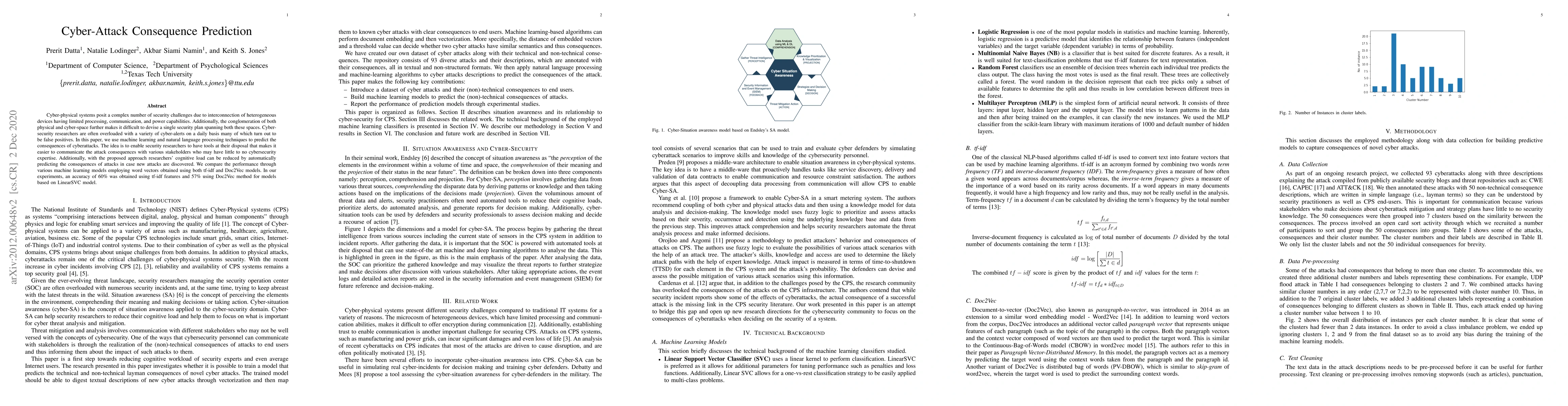 Researchers used machine learning and natural language processing to predict cyberattack consequences, achieving 60% accuracy with tf-idf features and 57% with Doc2Vec.