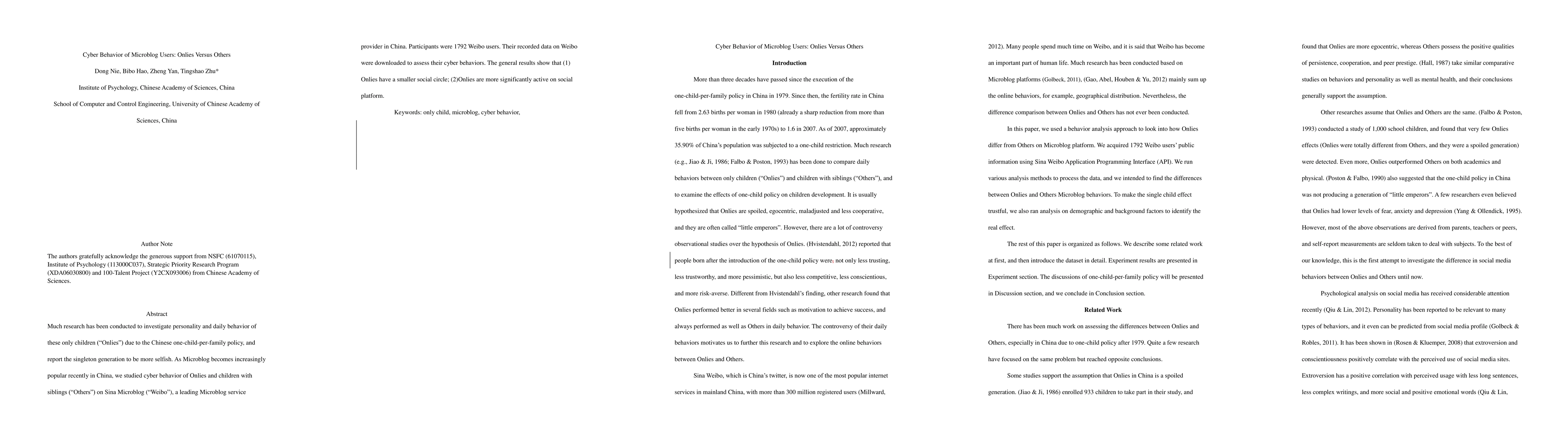This study investigates the cyber behavior of 'Onlies' (only children) versus 'Others' (children with siblings) on Sina Weibo, finding that Onlies have smaller social circles but are more active on the platform. The research involved analyzing data from 1792 Weibo users.