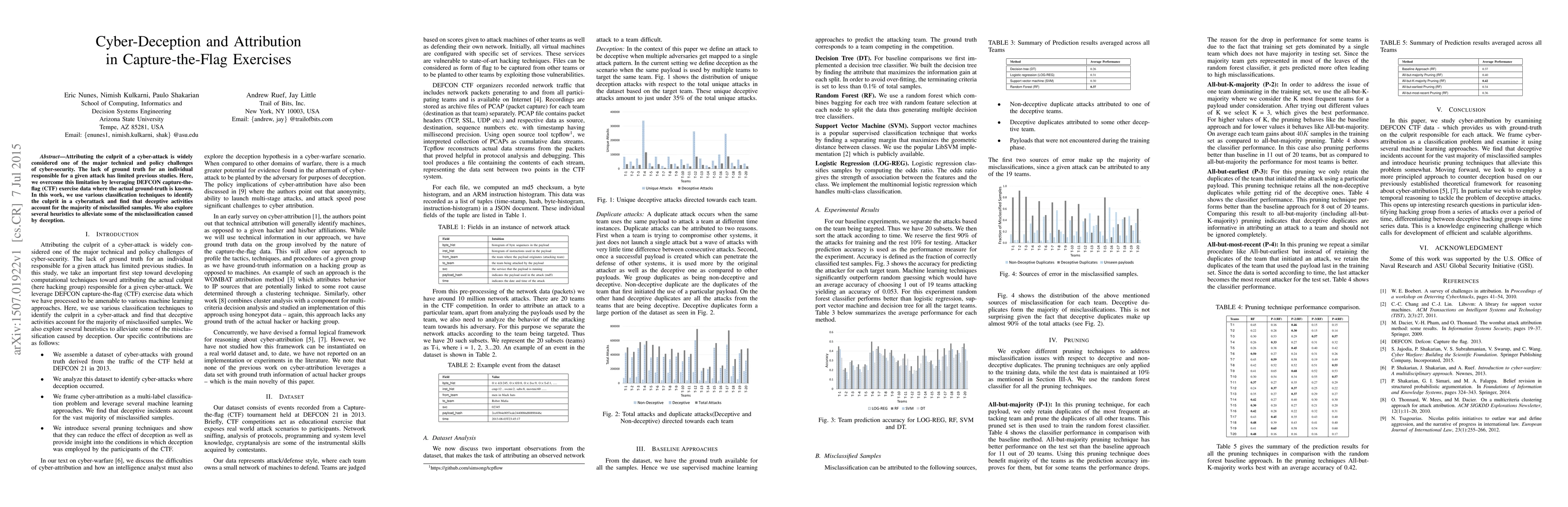 Researchers used DEFCON capture-the-flag exercise data to identify culprits in cyber-attacks and found that deception is a major cause of misclassification. They developed heuristics to alleviate this issue, highlighting the need for more effective attribution techniques.