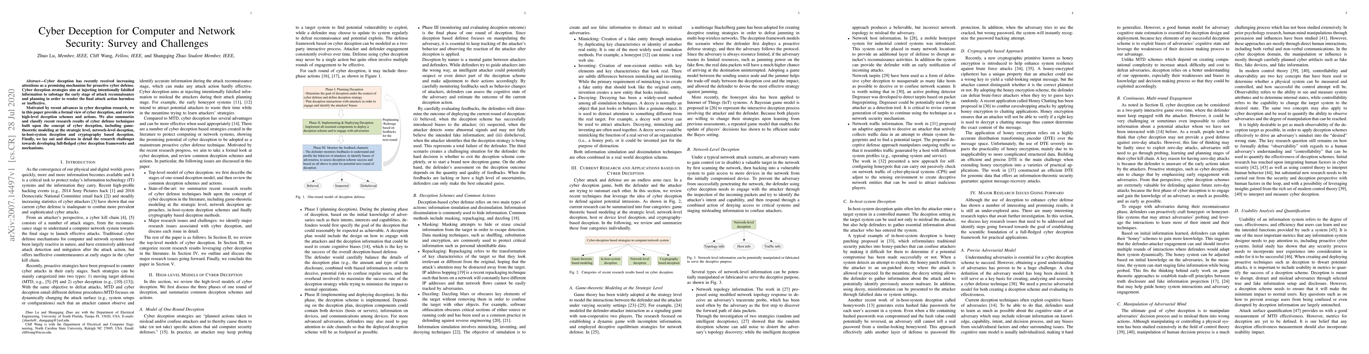 Cyber deception has recently received increasing attentions as a promising mechanism for proactive cyber defense. Cyber deception strategies aim at injecting intentionally falsified information to sabotage the early stage of attack reconnaissance and planning in order to render the final attack action harmless or ineffective. Motivated by recent advances in cyber deception research, we in this paper provide a formal view of cyber deception, and review high-level deception schemes and actions. We also summarize and classify recent research results of cyber defense techniques built upon the concept of cyber deception, including game-theoretic modeling at the strategic level, network-level deception, in-host-system deception and cryptography based deception. Finally, we lay out and discuss in detail the research challenges towards developing full-fledged cyber deception frameworks and mechanisms.