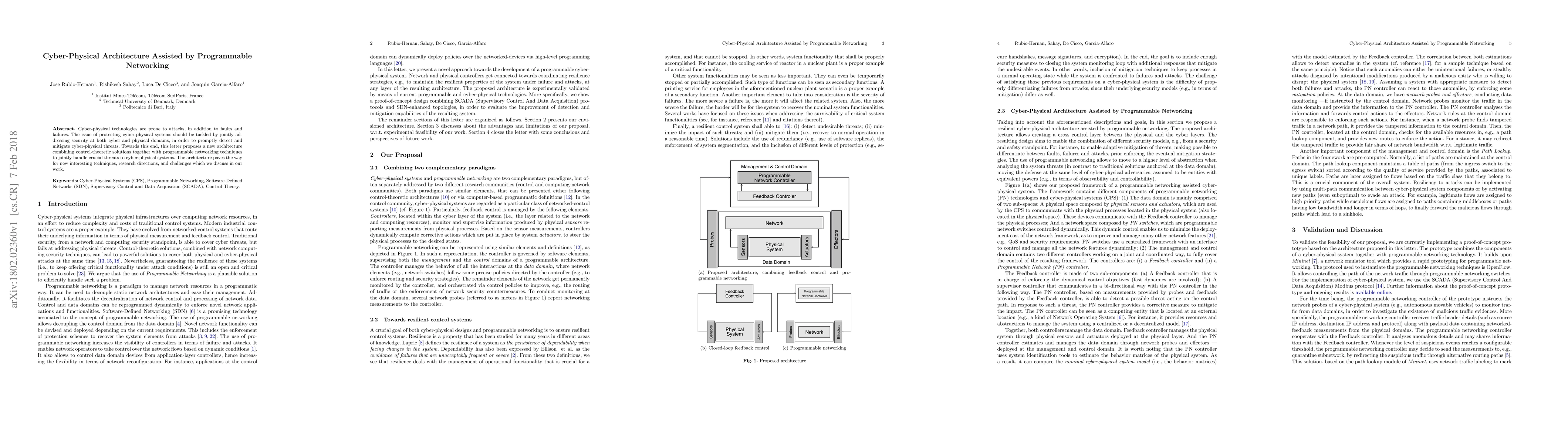 Cyber-physical technologies are prone to attacks, in addition to faults and failures. The issue of protecting cyber-physical systems should be tackled by jointly addressing security at both cyber and physical domains, in order to promptly detect and mitigate cyber-physical threats. Towards this end, this letter proposes a new architecture combining control-theoretic solutions together with programmable networking techniques to jointly handle crucial threats to cyber-physical systems. The architecture paves the way for new interesting techniques, research directions, and challenges which we discuss in our work.