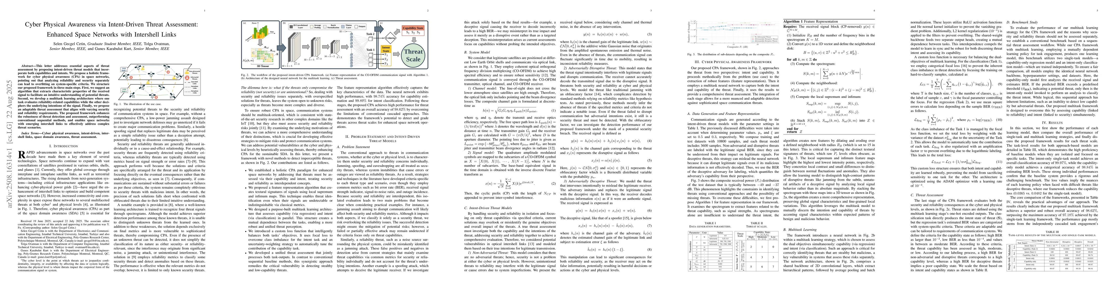 This letter addresses essential aspects of threat assessment by proposing intent-driven threat models that incorporate both capabilities and intents. We propose a holistic framework for cyber physical awareness (CPA) in space networks, pointing out that analyzing reliability and security separately can lead to overfitting on system-specific criteria. We structure our proposed framework in three main steps. First, we suggest an algorithm that extracts characteristic properties of the received signal to facilitate an intuitive understanding of potential threats. Second, we develop a multitask learning architecture where one task evaluates reliability-related capabilities while the other deciphers the underlying intentions of the signal. Finally, we propose an adaptable threat assessment that aligns with varying security and reliability requirements. The proposed framework enhances the robustness of threat detection and assessment, outperforming conventional sequential methods, and enables space networks with emerging intershell links to effectively address complex threat scenarios.