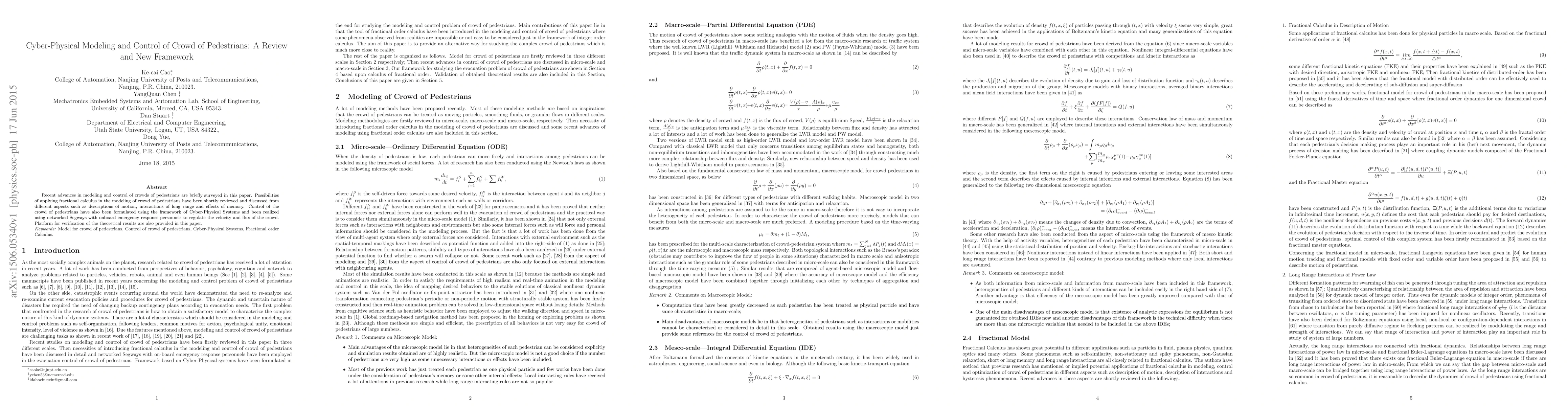 Recent advances in modeling and control of crowds of pedestrians are briefly surveyed in this paper. Possibilities of applying fractional calculus in the modeling of crowd of pedestrians have been shortly reviewed and discussed from different aspects such as descriptions of motion, interactions of long range and effects of memory. Control of the crowd of pedestrians have also been formulated using the framework of Cyber-Physical Systems and been realized using networked Segways with onboard emergency response personnels to regulate the velocity and flux of the crowd. Platform for verification of the theoretical results are also provided in this paper.