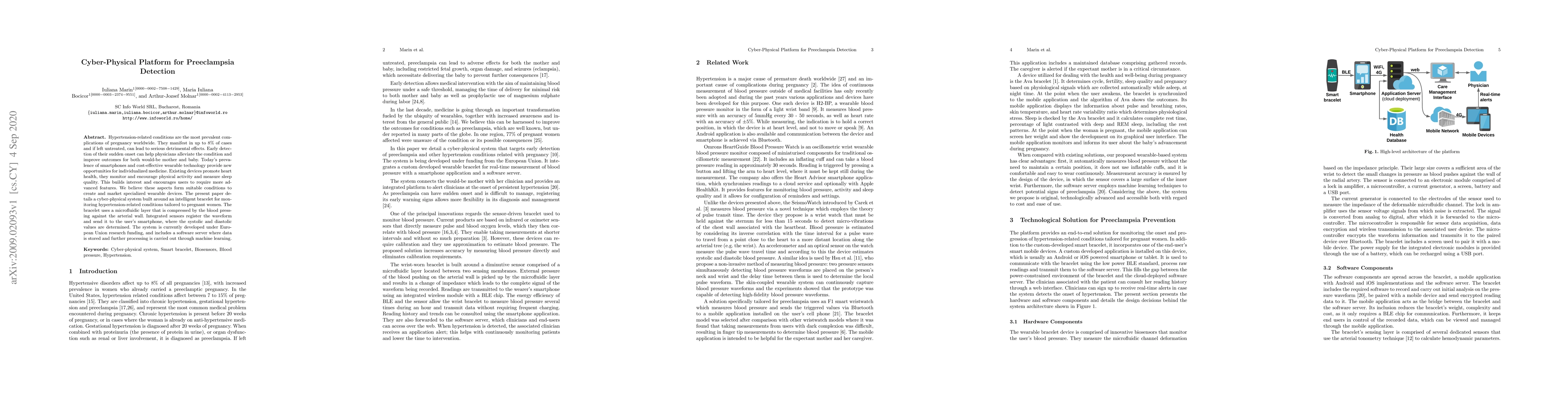 Hypertension-related conditions are the most prevalent complications of pregnancy worldwide. They manifest in up to 8% of cases and if left untreated, can lead to serious detrimental effects. Early detection of their sudden onset can help physicians alleviate the condition and improve outcomes for both would-be mother and baby. Today's prevalence of smartphones and cost-effective wearable technology provide new opportunities for individualized medicine. Existing devices promote heart health, they monitor and encourage physical activity and measure sleep quality. This builds interest and encourages users to require more advanced features. We believe these aspects form suitable conditions to create and market specialized wearable devices. The present paper details a cyber-physical system built around an intelligent bracelet for monitoring hypertension-related conditions tailored to pregnant women. The bracelet uses a microfluidic layer that is compressed by the blood pressing against the arterial wall. Integrated sensors register the waveform and send it to the user's smartphone, where the systolic and diastolic values are determined. The system is currently developed under European Union research funding, and includes a software server where data is stored and further processing is carried out through machine learning.