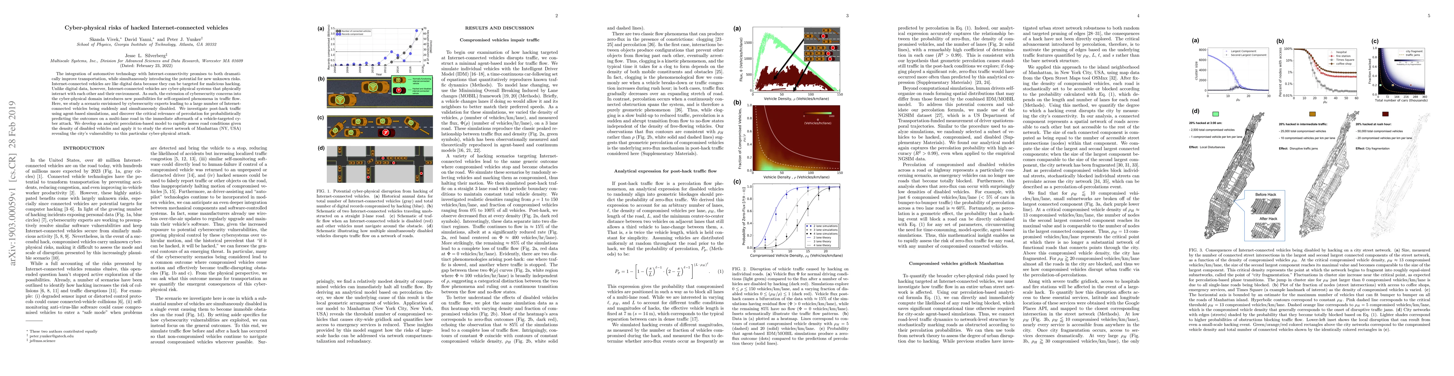 This paper explores the cyber-physical risks of hacked Internet-connected vehicles, focusing on the potential for large-scale simultaneous vehicle disablement and its impact on traffic flow. Using agent-based simulations and a percolation-based model, it assesses Manhattan's vulnerability, highlighting the critical role of percolation in predicting post-hack traffic conditions.