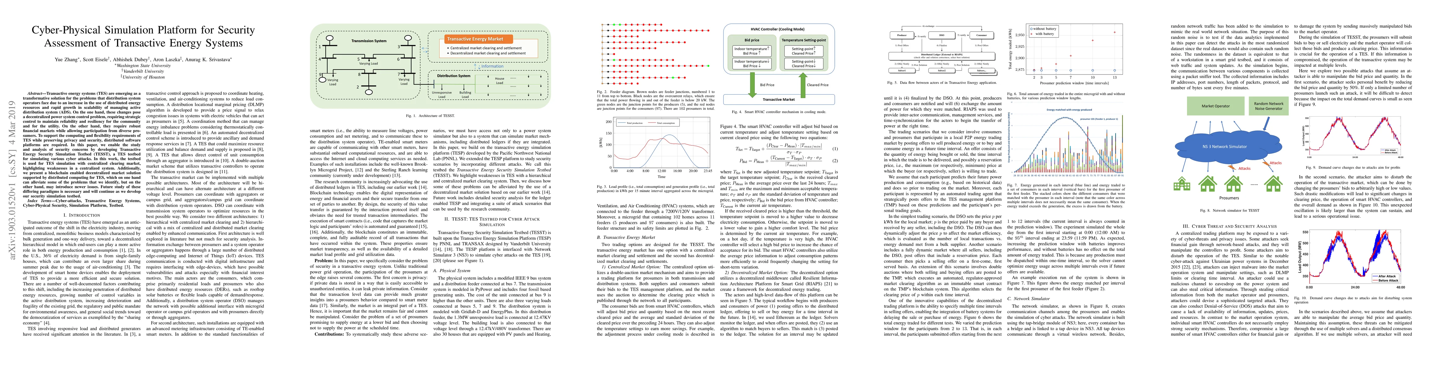 A new simulation testbed called TESST is developed to study security concerns in transactive energy systems, highlighting weaknesses in centralized systems and proposing a blockchain-enabled decentralized market solution with distributed computing.