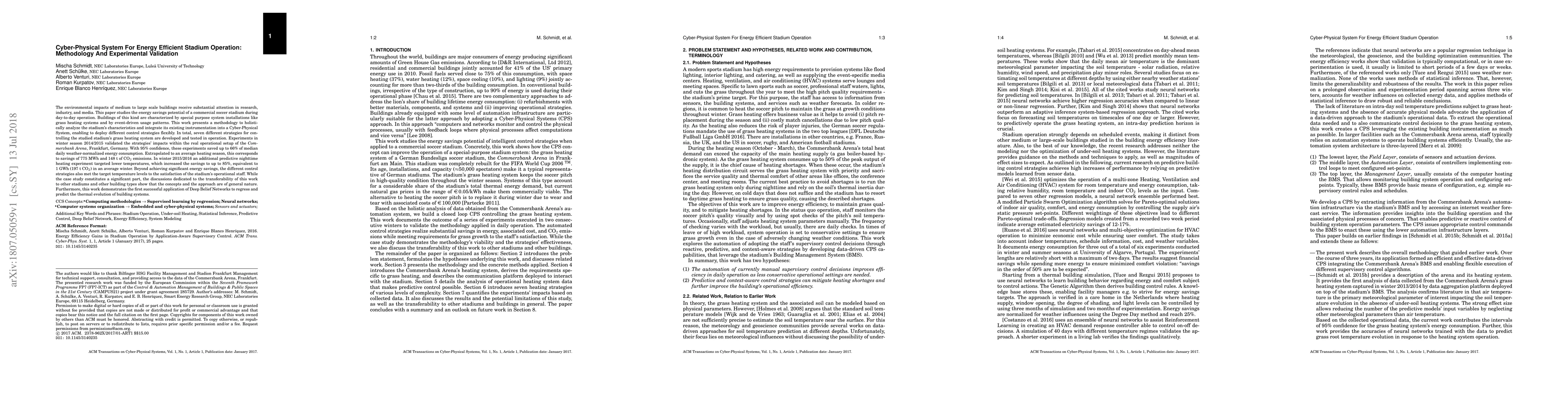 The environmental impacts of medium to large scale buildings receive substantial attention in research, industry, and media. This paper studies the energy savings potential of a commercial soccer stadium during day-to-day operation. Buildings of this kind are characterized by special purpose system installations like grass heating systems and by event-driven usage patterns. This work presents a methodology to holistically analyze the stadiums characteristics and integrate its existing instrumentation into a Cyber-Physical System, enabling to deploy different control strategies flexibly. In total, seven different strategies for controlling the studied stadiums grass heating system are developed and tested in operation. Experiments in winter season 2014/2015 validated the strategies impacts within the real operational setup of the Commerzbank Arena, Frankfurt, Germany. With 95% confidence, these experiments saved up to 66% of median daily weather-normalized energy consumption. Extrapolated to an average heating season, this corresponds to savings of 775 MWh and 148 t of CO2 emissions. In winter 2015/2016 an additional predictive nighttime heating experiment targeted lower temperatures, which increased the savings to up to 85%, equivalent to 1 GWh (197 t CO2) in an average winter. Beyond achieving significant energy savings, the different control strategies also met the target temperature levels to the satisfaction of the stadiums operational staff. While the case study constitutes a significant part, the discussions dedicated to the transferability of this work to other stadiums and other building types show that the concepts and the approach are of general nature. Furthermore, this work demonstrates the first successful application of Deep Belief Networks to regress and predict the thermal evolution of building systems.