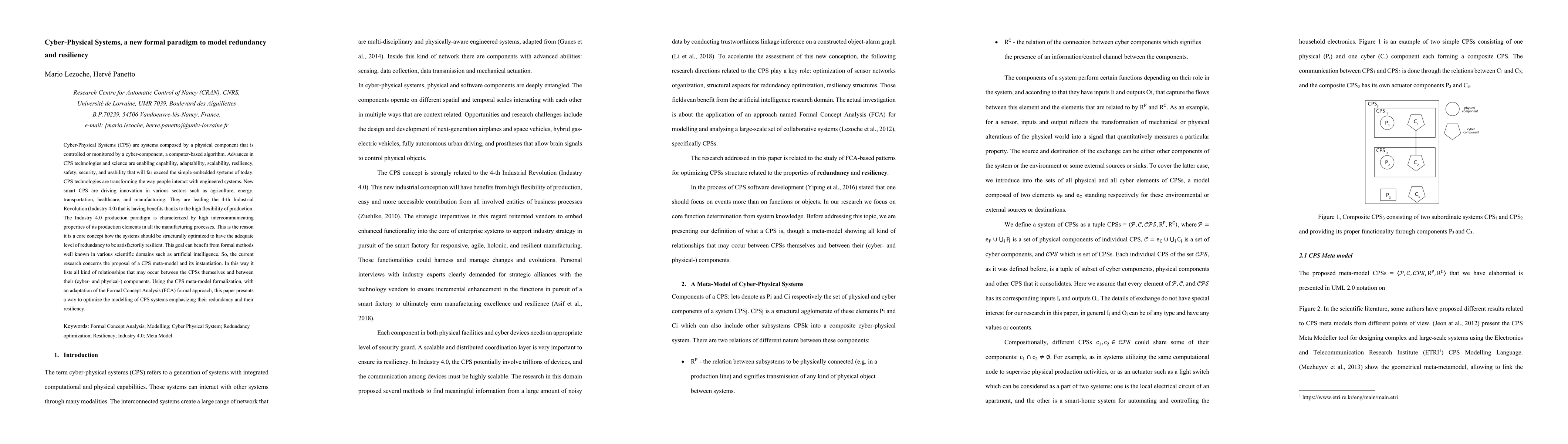 Cyber-Physical Systems (CPS) are systems composed by a physical component that is controlled or monitored by a cyber-component, a computer-based algorithm. Advances in CPS technologies and science are enabling capability, adaptability, scalability, resiliency, safety, security, and usability that will far exceed the simple embedded systems of today. CPS technologies are transforming the way people interact with engineered systems. New smart CPS are driving innovation in various sectors such as agriculture, energy, transportation, healthcare, and manufacturing. They are leading the 4-th Industrial Revolution (Industry 4.0) that is having benefits thanks to the high flexibility of production. The Industry 4.0 production paradigm is characterized by high intercommunicating properties of its production elements in all the manufacturing processes. This is the reason it is a core concept how the systems should be structurally optimized to have the adequate level of redundancy to be satisfactorily resilient. This goal can benefit from formal methods well known in various scientific domains such as artificial intelligence. So, the current research concerns the proposal of a CPS meta-model and its instantiation. In this way it lists all kind of relationships that may occur between the CPSs themselves and between their (cyber-and physical-) components. Using the CPS meta-model formalization, with an adaptation of the Formal Concept Analysis (FCA) formal approach, this paper presents a way to optimize the modelling of CPS systems emphasizing their redundancy and their resiliency.