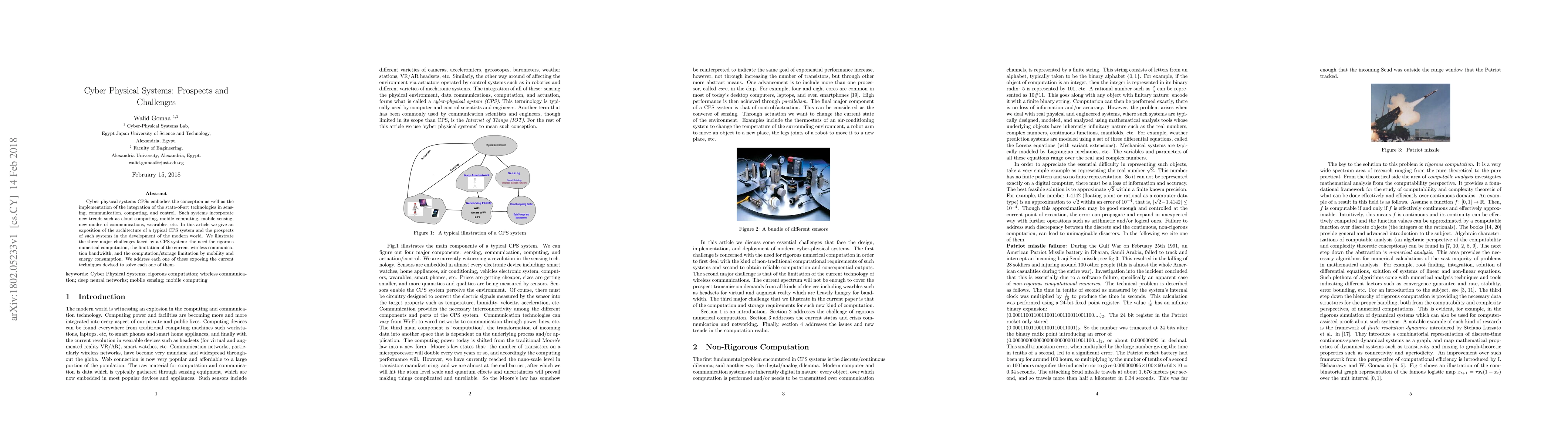 Cyber physical systems CPSs embodies the conception as well as the implementation of the integration of the state-of-art technologies in sensing, communication, computing, and control. Such systems incorporate new trends such as cloud computing, mobile computing, mobile sensing, new modes of communications, wearables, etc. In this article we give an exposition of the architecture of a typical CPS system and the prospects of such systems in the development of the modern world. We illustrate the three major challenges faced by a CPS system: the need for rigorous numerical computation, the limitation of the current wireless communication bandwidth, and the computation/storage limitation by mobility and energy consumption. We address each one of these exposing the current techniques devised to solve each one of them.