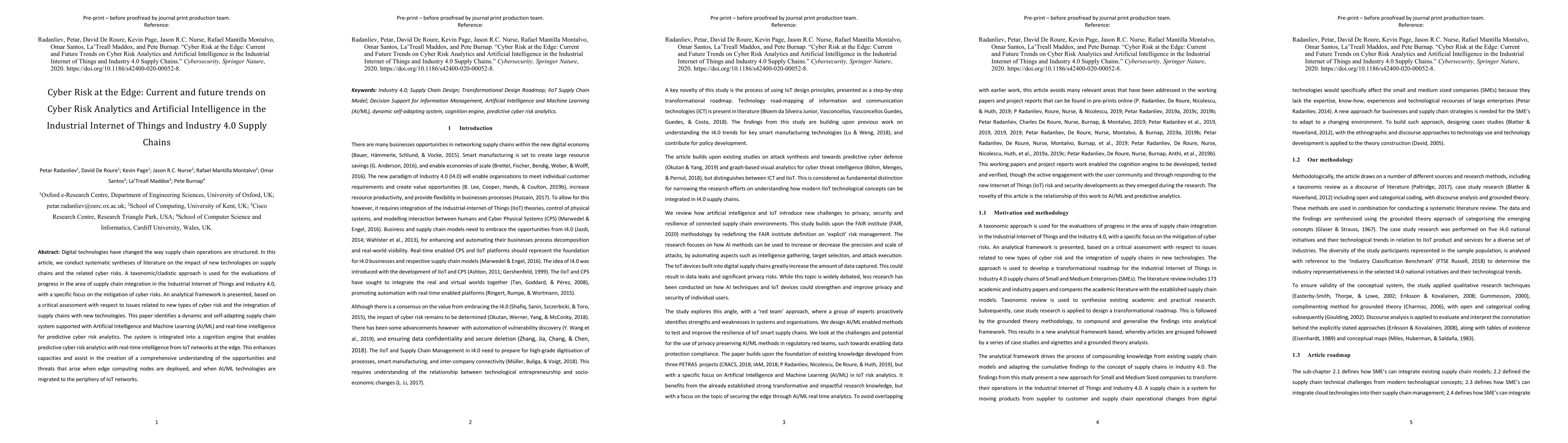 Digital technologies have changed the way supply chain operations are structured. In this article, we conduct systematic syntheses of literature on the impact of new technologies on supply chains and the related cyber risks. A taxonomic/cladistic approach is used for the evaluations of progress in the area of supply chain integration in the Industrial Internet of Things and Industry 4.0, with a specific focus on the mitigation of cyber risks. An analytical framework is presented, based on a critical assessment with respect to issues related to new types of cyber risk and the integration of supply chains with new technologies. This paper identifies a dynamic and self-adapting supply chain system supported with Artificial Intelligence and Machine Learning (AI/ML) and real-time intelligence for predictive cyber risk analytics. The system is integrated into a cognition engine that enables predictive cyber risk analytics with real-time intelligence from IoT networks at the edge. This enhances capacities and assist in the creation of a comprehensive understanding of the opportunities and threats that arise when edge computing nodes are deployed, and when AI/ML technologies are migrated to the periphery of IoT networks.