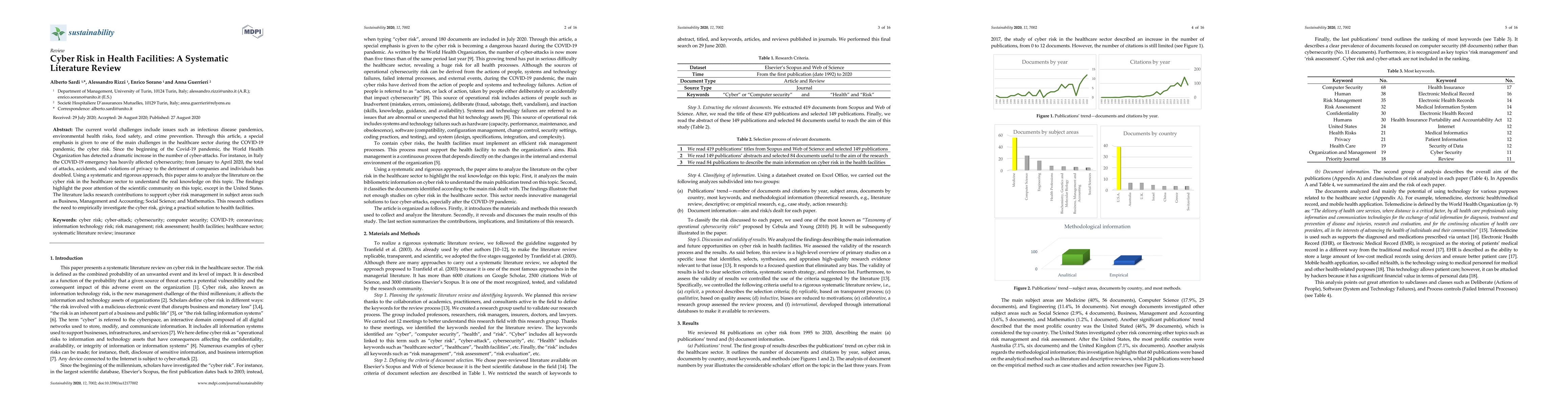 The current world challenges include issues such as infectious disease pandemics, environmental health risks, food safety, and crime prevention. Through this article, a special emphasis is given to one of the main challenges in the healthcare sector during the COVID-19 pandemic, the cyber risk. Since the beginning of the Covid-19 pandemic, the World Health Organization has detected a dramatic increase in the number of cyber-attacks. For instance, in Italy the COVID-19 emergency has heavily affected cybersecurity; from January to April 2020, the total of attacks, accidents, and violations of privacy to the detriment of companies and individuals has doubled. Using a systematic and rigorous approach, this paper aims to analyze the literature on the cyber risk in the healthcare sector to understand the real knowledge on this topic. The findings highlight the poor attention of the scientific community on this topic, except in the United States. The literature lacks research contributions to support cyber risk management in subject areas such as Business, Management and Accounting; Social Science; and Mathematics. This research outlines the need to empirically investigate the cyber risk, giving a practical solution to health facilities. Keywords: cyber risk; cyber-attack; cybersecurity; computer security; COVID-19; coronavirus;information technology risk; risk management; risk assessment; health facilities; healthcare sector;systematic literature review; insurance