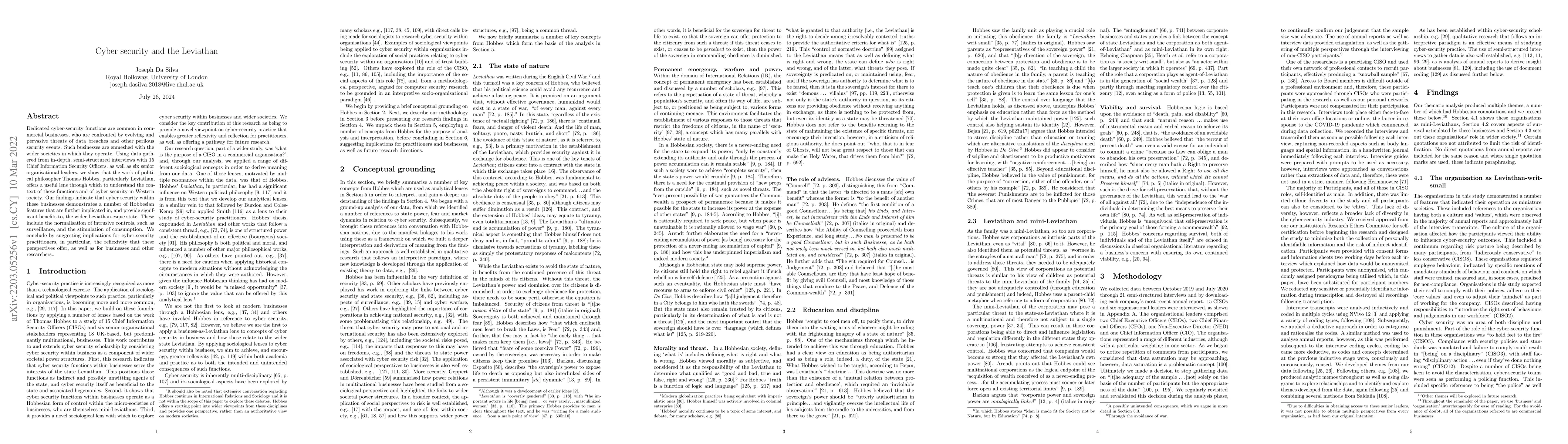 This paper explores how cyber security functions in commercial businesses reflect the principles of Thomas Hobbes' Leviathan, emphasizing intrusive controls and surveillance, and suggesting these practices benefit the broader societal structure. The study uses interviews with Chief Information Security Officers and senior leaders to draw these connections.
