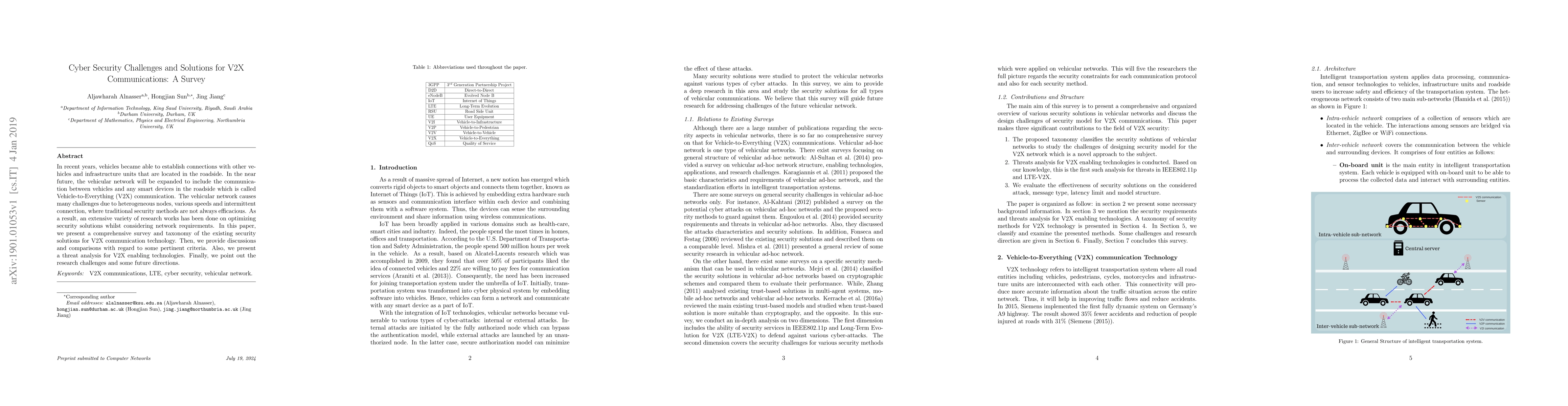 This paper surveys security challenges and solutions for Vehicle-to-Everything (V2X) communications, discussing various security methods and their effectiveness amidst heterogeneous nodes and intermittent connections. It also analyzes threats and highlights future research directions.