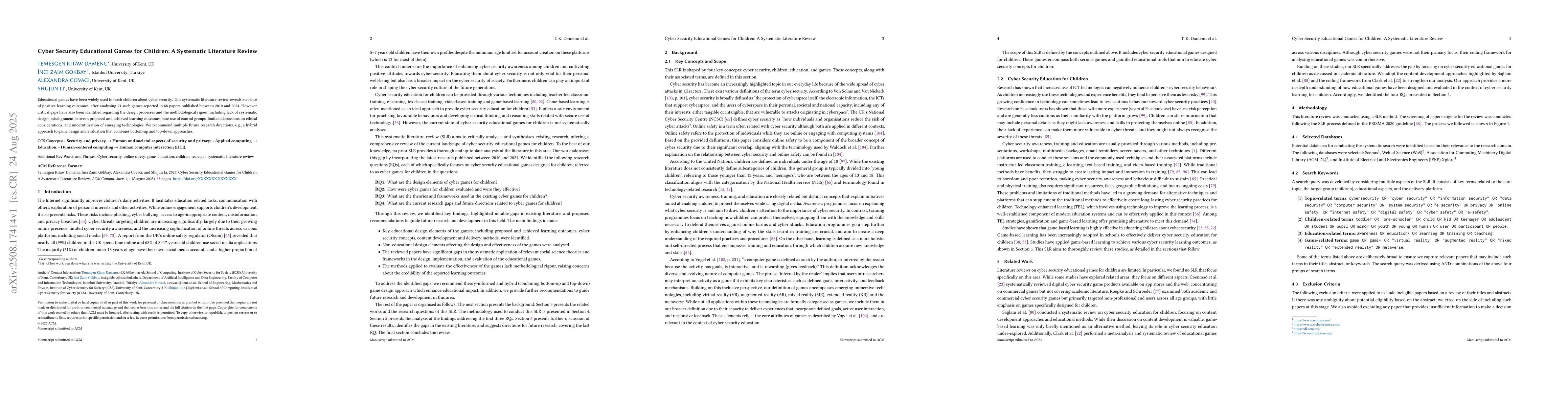 Educational games have been widely used to teach children about cyber security. This systematic literature review reveals evidence of positive learning outcomes, after analysing 91 such games reported in 68 papers published between 2010 and 2024. However, critical gaps have also been identified regarding the design processes and the methodological rigour, including lack of systematic design, misalignment between proposed and achieved learning outcomes, rare use of control groups, limited discussions on ethical considerations, and underutilisation of emerging technologies. We recommend multiple future research directions, e.g., a hybrid approach to game design and evaluation that combines bottom-up and top-down approaches.