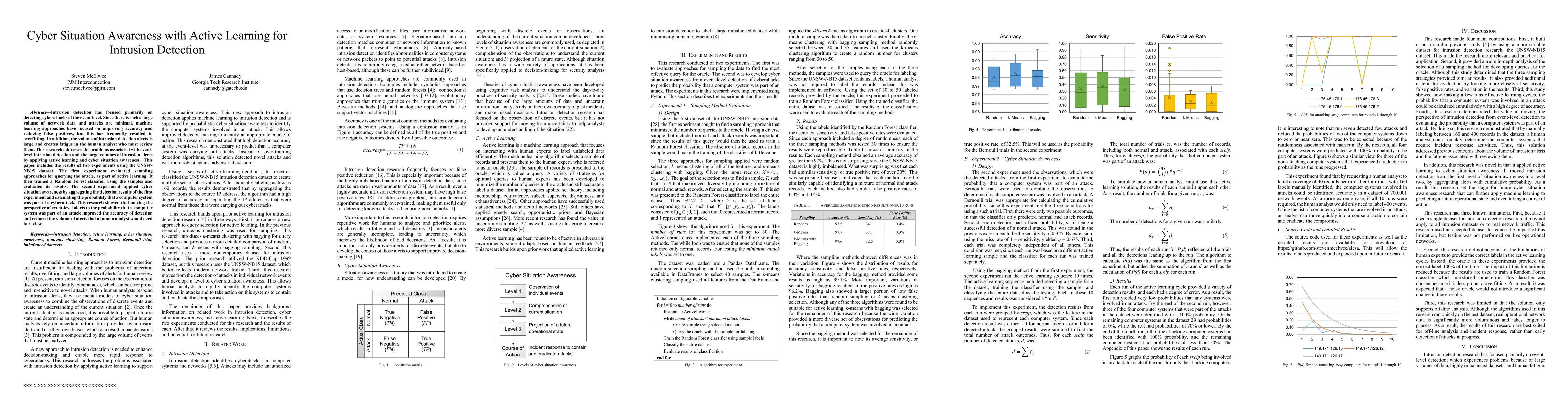 Intrusion detection has focused primarily on detecting cyberattacks at the event-level. Since there is such a large volume of network data and attacks are minimal, machine learning approaches have focused on improving accuracy and reducing false positives, but this has frequently resulted in overfitting. In addition, the volume of intrusion detection alerts is large and creates fatigue in the human analyst who must review them. This research addresses the problems associated with event-level intrusion detection and the large volumes of intrusion alerts by applying active learning and cyber situation awareness. This paper includes the results of two experiments using the UNSW-NB15 dataset. The first experiment evaluated sampling approaches for querying the oracle, as part of active learning. It then trained a Random Forest classifier using the samples and evaluated its results. The second experiment applied cyber situation awareness by aggregating the detection results of the first experiment and calculating the probability that a computer system was part of a cyberattack. This research showed that moving the perspective of event-level alerts to the probability that a computer system was part of an attack improved the accuracy of detection and reduced the volume of alerts that a human analyst would need to review.