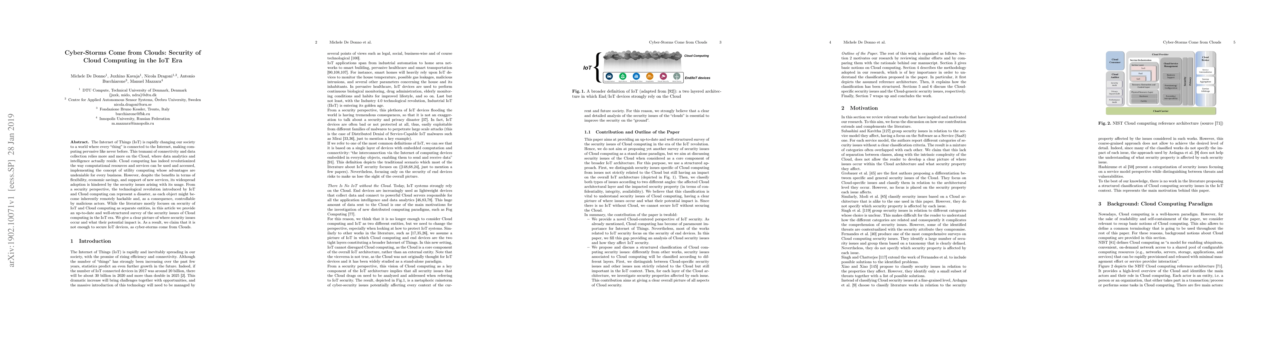 The Internet of Things (IoT) is rapidly changing our society to a world where every "thing" is connected to the Internet, making computing pervasive like never before. This tsunami of connectivity and data collection relies more and more on the Cloud, where data analytics and intelligence actually reside. Cloud computing has indeed revolutionized the way computational resources and services can be used and accessed, implementing the concept of utility computing whose advantages are undeniable for every business. However, despite the benefits in terms of flexibility, economic savings, and support of new services, its widespread adoption is hindered by the security issues arising with its usage. From a security perspective, the technological revolution introduced by IoT and Cloud computing can represent a disaster, as each object might become inherently remotely hackable and, as a consequence, controllable by malicious actors. While the literature mostly focuses on security of IoT and Cloud computing as separate entities, in this article we provide an up-to-date and well-structured survey of the security issues of Cloud computing in the IoT era. We give a clear picture of where security issues occur and what their potential impact is. As a result, we claim that it is not enough to secure IoT devices, as cyber-storms come from Clouds.