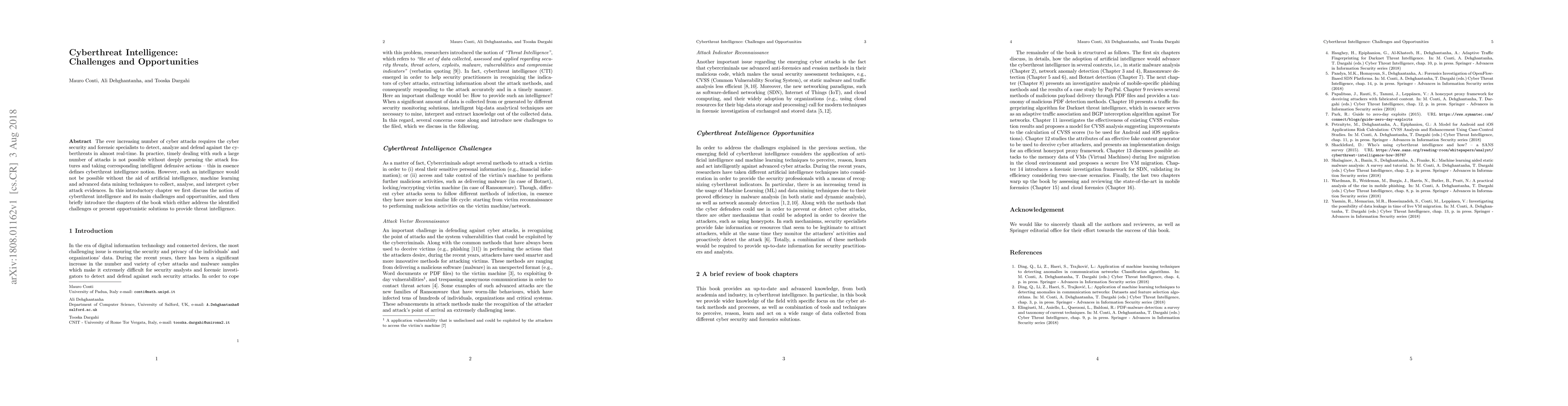 This paper explores the concept of cyber threat intelligence, emphasizing the necessity for advanced techniques like AI and machine learning to analyze and respond to cyber attacks. It outlines the challenges and opportunities in this field, and introduces subsequent chapters that address these challenges with innovative solutions.