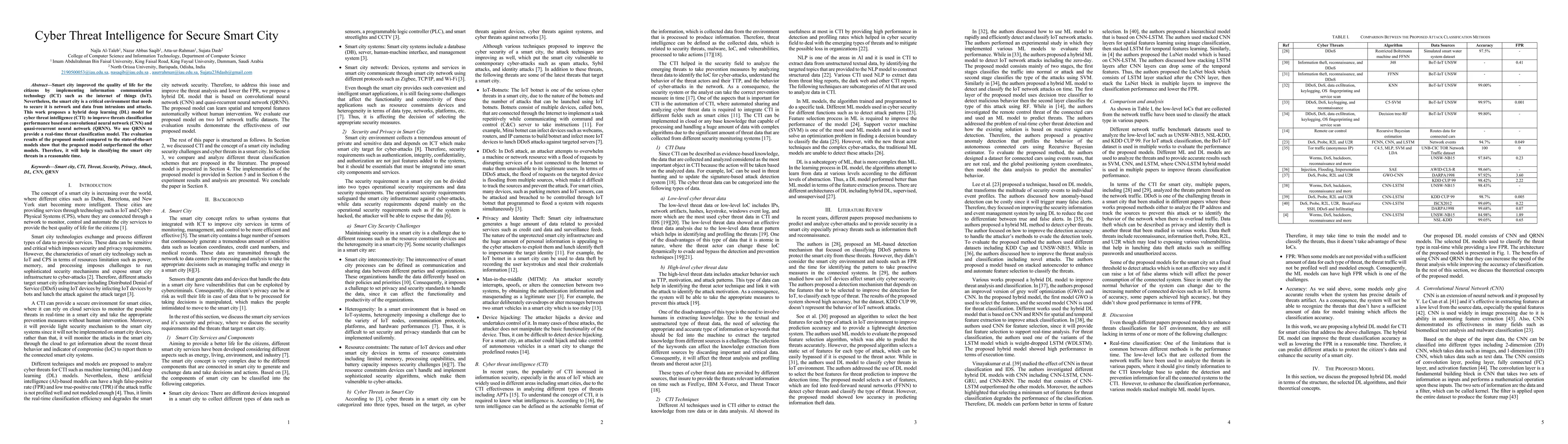 A hybrid deep learning model using convolutional neural networks and quasi-recurrent neural networks outperforms state-of-the-art models in classifying smart city threats in real-time.