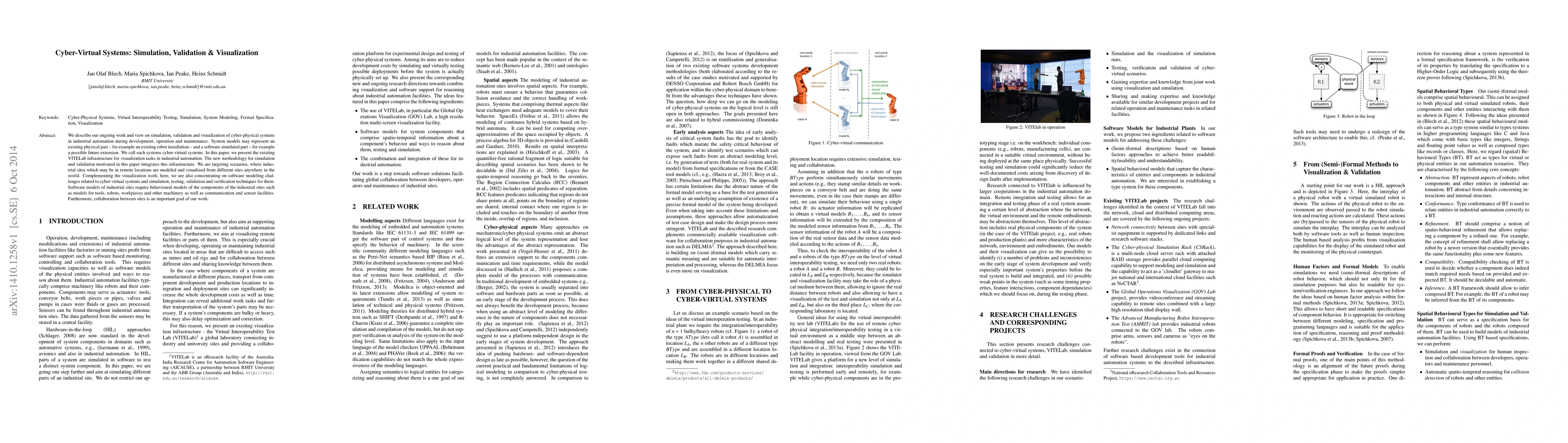 We describe our ongoing work and view on simulation, validation and visualization of cyber-physical systems in industrial automation during development, operation and maintenance. System models may represent an existing physical part - for example an existing robot installation - and a software simulated part - for example a possible future extension. We call such systems cyber-virtual systems. In this paper, we present the existing VITELab infrastructure for visualization tasks in industrial automation. The new methodology for simulation and validation motivated in this paper integrates this infrastructure. We are targeting scenarios, where industrial sites which may be in remote locations are modeled and visualized from different sites anywhere in the world. Complementing the visualization work, here, we are also concentrating on software modeling challenges related to cyber-virtual systems and simulation, testing, validation and verification techniques for them. Software models of industrial sites require behavioural models of the components of the industrial sites such as models for tools, robots, workpieces and other machinery as well as communication and sensor facilities. Furthermore, collaboration between sites is an important goal of our work.