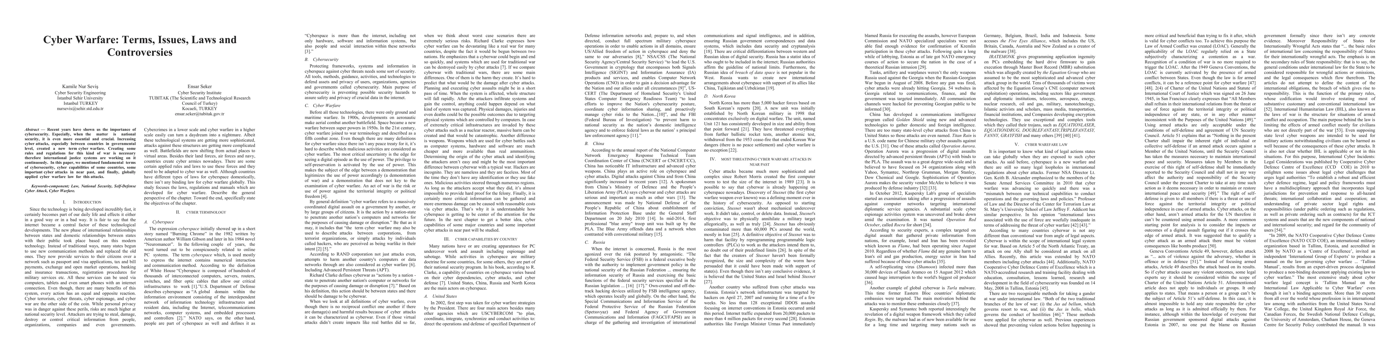 This paper explores the emerging concept of cyber warfare, detailing its fundamental terms, the cyber capabilities of various nations, notable past cyber attacks, and the international legal frameworks being developed to address these issues. It underscores the necessity for global cooperation in establishing rules to combat cyber threats to national security.
