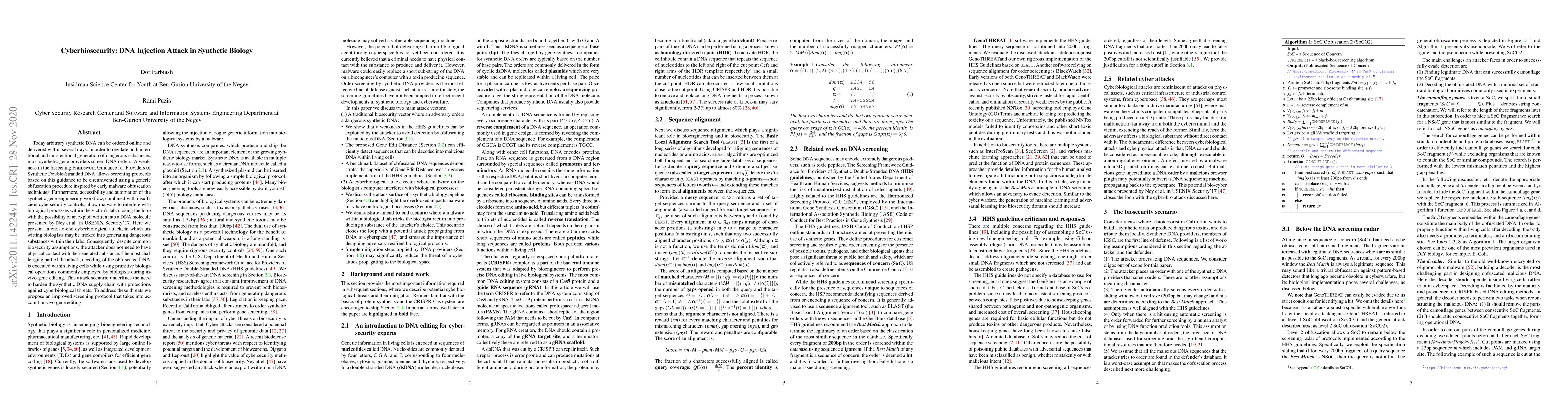 Today arbitrary synthetic DNA can be ordered online and delivered within several days. In order to regulate both intentional and unintentional generation of dangerous substances, most synthetic gene providers screen DNA orders. A weakness in the Screening Framework Guidance for Providers of Synthetic Double-Stranded DNA allows screening protocols based on this guidance to be circumvented using a generic obfuscation procedure inspired by early malware obfuscation techniques. Furthermore, accessibility and automation of the synthetic gene engineering workflow, combined with insufficient cybersecurity controls, allow malware to interfere with biological processes within the victim's lab, closing the loop with the possibility of an exploit written into a DNA molecule presented by Ney et al. in USENIX Security'17. Here we present an end-to-end cyberbiological attack, in which unwitting biologists may be tricked into generating dangerous substances within their labs. Consequently, despite common biosecurity assumptions, the attacker does not need to have physical contact with the generated substance. The most challenging part of the attack, decoding of the obfuscated DNA, is executed within living cells while using primitive biological operations commonly employed by biologists during in-vivo gene editing. This attack scenario underlines the need to harden the synthetic DNA supply chain with protections against cyberbiological threats. To address these threats we propose an improved screening protocol that takes into account in-vivo gene editing.
