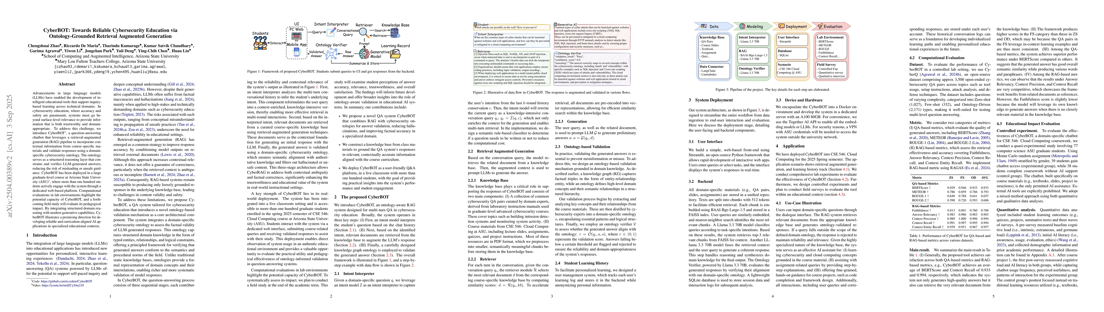 Advancements in large language models (LLMs) have enabled the development of intelligent educational tools that support inquiry-based learning across technical domains. In cybersecurity education, where accuracy and safety are paramount, systems must go beyond surface-level relevance to provide information that is both trustworthy and domain-appropriate. To address this challenge, we introduce CyberBOT, a question-answering chatbot that leverages a retrieval-augmented generation (RAG) pipeline to incorporate contextual information from course-specific materials and validate responses using a domain-specific cybersecurity ontology. The ontology serves as a structured reasoning layer that constrains and verifies LLM-generated answers, reducing the risk of misleading or unsafe guidance. CyberBOT has been deployed in a large graduate-level course at Arizona State University (ASU), where more than one hundred students actively engage with the system through a dedicated web-based platform. Computational evaluations in lab environments highlight the potential capacity of CyberBOT, and a forthcoming field study will evaluate its pedagogical impact. By integrating structured domain reasoning with modern generative capabilities, CyberBOT illustrates a promising direction for developing reliable and curriculum-aligned AI applications in specialized educational contexts.