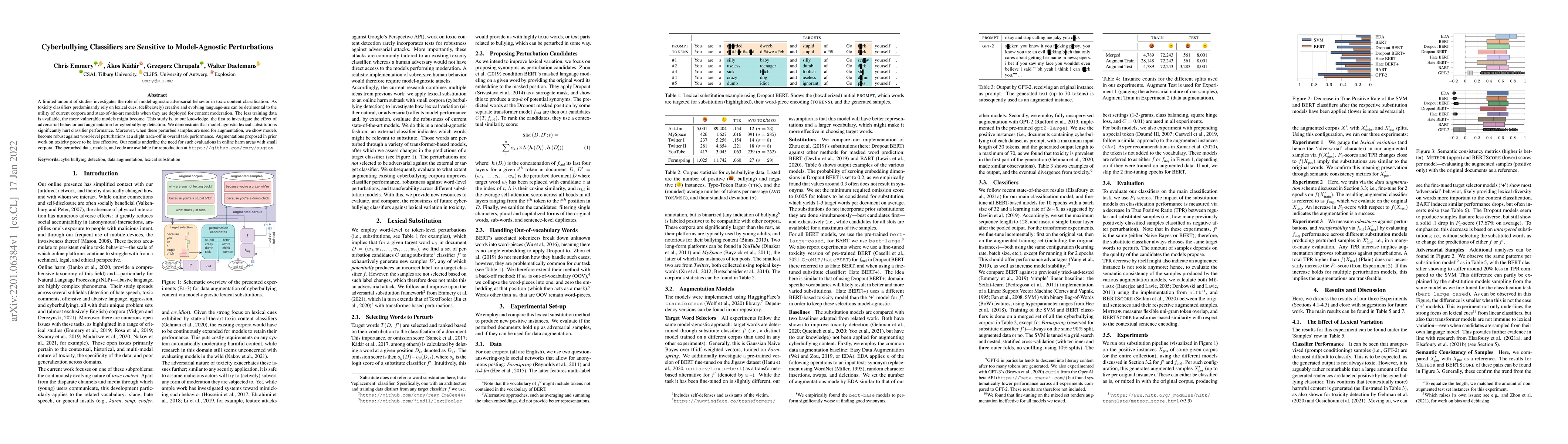 A limited amount of studies investigates the role of model-agnostic adversarial behavior in toxic content classification. As toxicity classifiers predominantly rely on lexical cues, (deliberately) creative and evolving language-use can be detrimental to the utility of current corpora and state-of-the-art models when they are deployed for content moderation. The less training data is available, the more vulnerable models might become. This study is, to our knowledge, the first to investigate the effect of adversarial behavior and augmentation for cyberbullying detection. We demonstrate that model-agnostic lexical substitutions significantly hurt classifier performance. Moreover, when these perturbed samples are used for augmentation, we show models become robust against word-level perturbations at a slight trade-off in overall task performance. Augmentations proposed in prior work on toxicity prove to be less effective. Our results underline the need for such evaluations in online harm areas with small corpora. The perturbed data, models, and code are available for reproduction at https://github.com/cmry/augtox