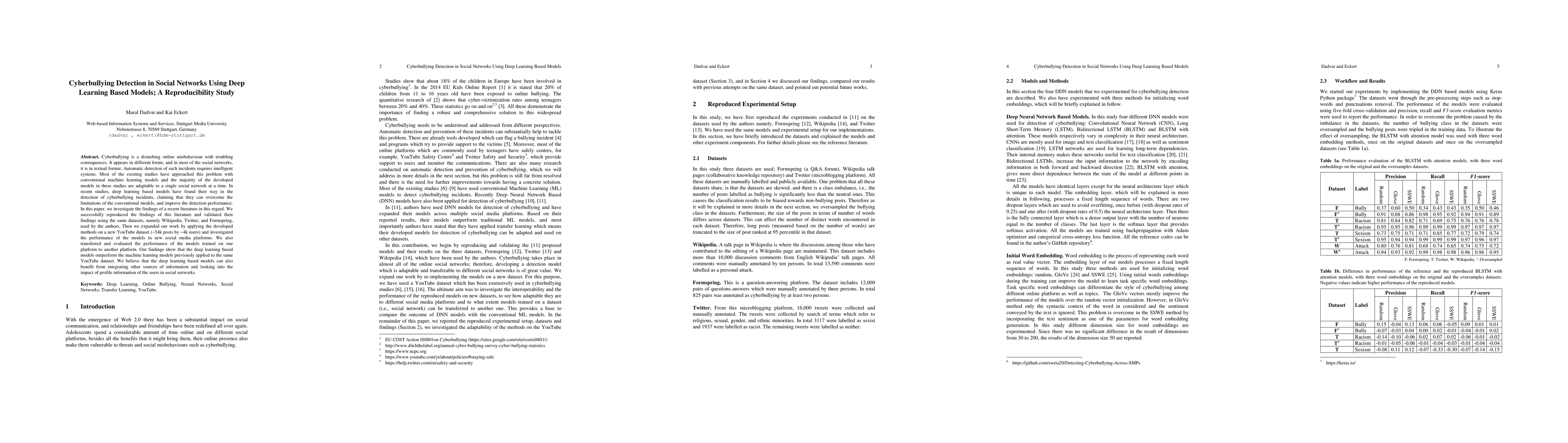 Cyberbullying is a disturbing online misbehaviour with troubling consequences. It appears in different forms, and in most of the social networks, it is in textual format. Automatic detection of such incidents requires intelligent systems. Most of the existing studies have approached this problem with conventional machine learning models and the majority of the developed models in these studies are adaptable to a single social network at a time. In recent studies, deep learning based models have found their way in the detection of cyberbullying incidents, claiming that they can overcome the limitations of the conventional models, and improve the detection performance. In this paper, we investigate the findings of a recent literature in this regard. We successfully reproduced the findings of this literature and validated their findings using the same datasets, namely Wikipedia, Twitter, and Formspring, used by the authors. Then we expanded our work by applying the developed methods on a new YouTube dataset (~54k posts by ~4k users) and investigated the performance of the models in new social media platforms. We also transferred and evaluated the performance of the models trained on one platform to another platform. Our findings show that the deep learning based models outperform the machine learning models previously applied to the same YouTube dataset. We believe that the deep learning based models can also benefit from integrating other sources of information and looking into the impact of profile information of the users in social networks.