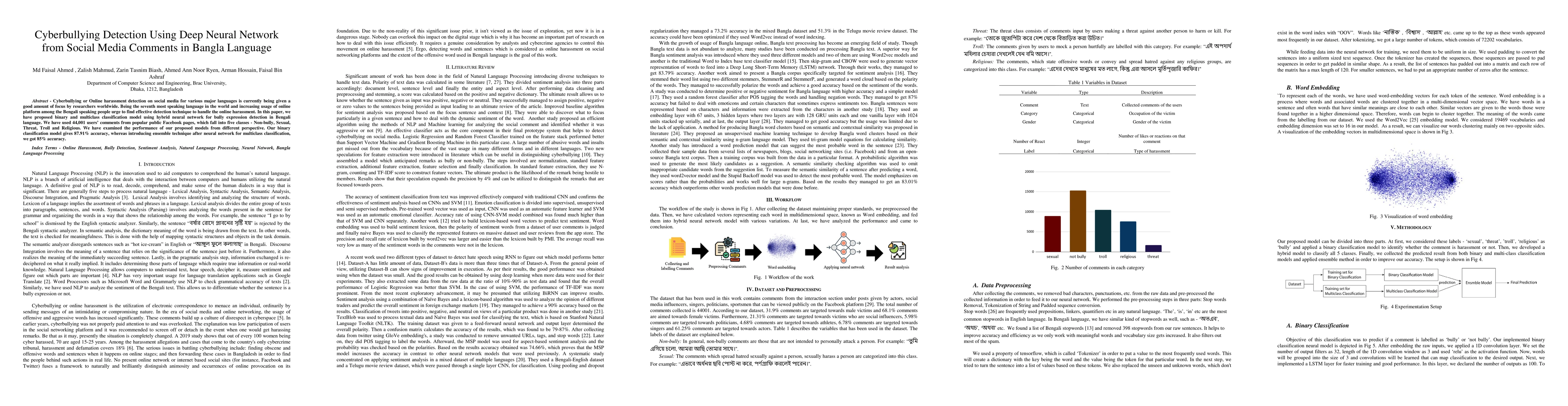 The paper presents a hybrid neural network model with Word2Vec for Bengali language cyberbullying detection, along with an ensemble technique to enhance multiclass classification accuracy.