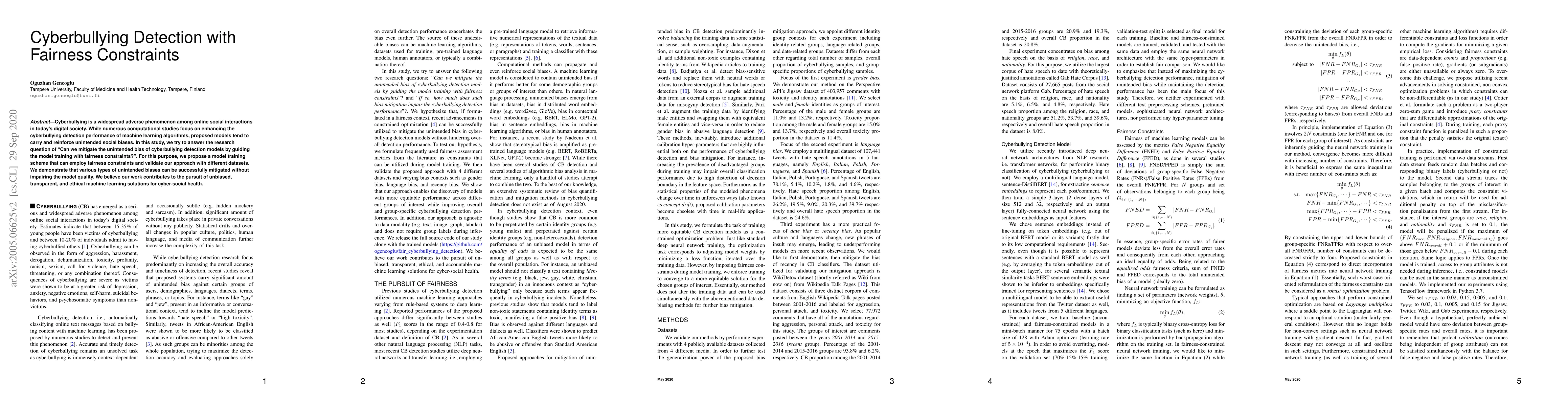 This paper proposes a machine learning model training scheme incorporating fairness constraints to mitigate unintended biases in cyberbullying detection, demonstrating that such biases can be reduced without compromising model performance. The study validates the approach using multiple datasets, contributing to more ethical and transparent machine learning solutions for online social health.
