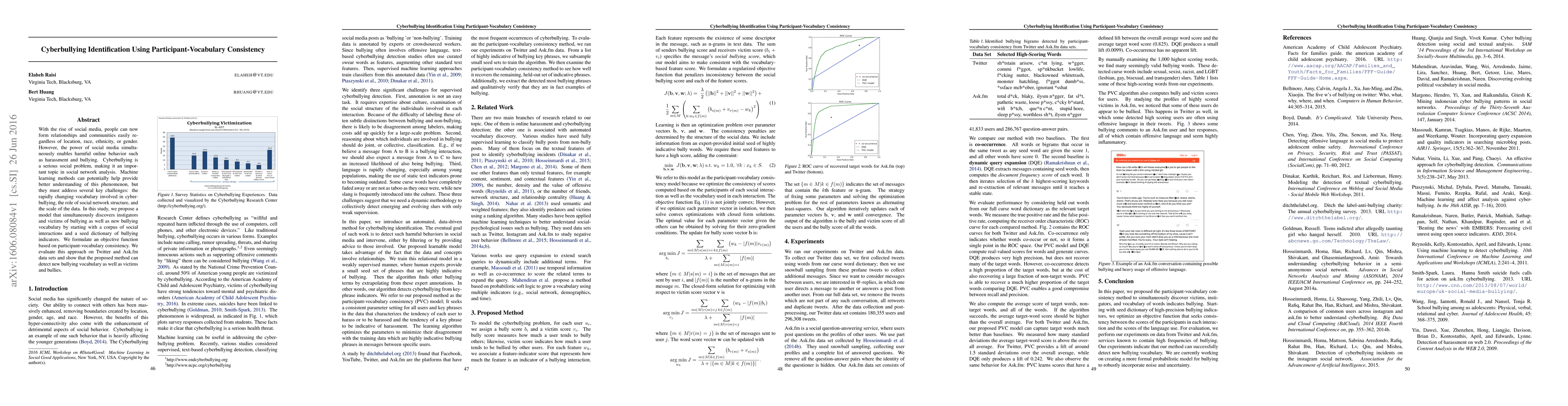 This study proposes a machine learning model to identify cyberbullying by leveraging participant-vocabulary consistency, addressing challenges like dynamic language and social network structure. The model discovers instigators, victims, and new bullying terms using Twitter and Ask.fm data, demonstrating effective detection of cyberbullying.