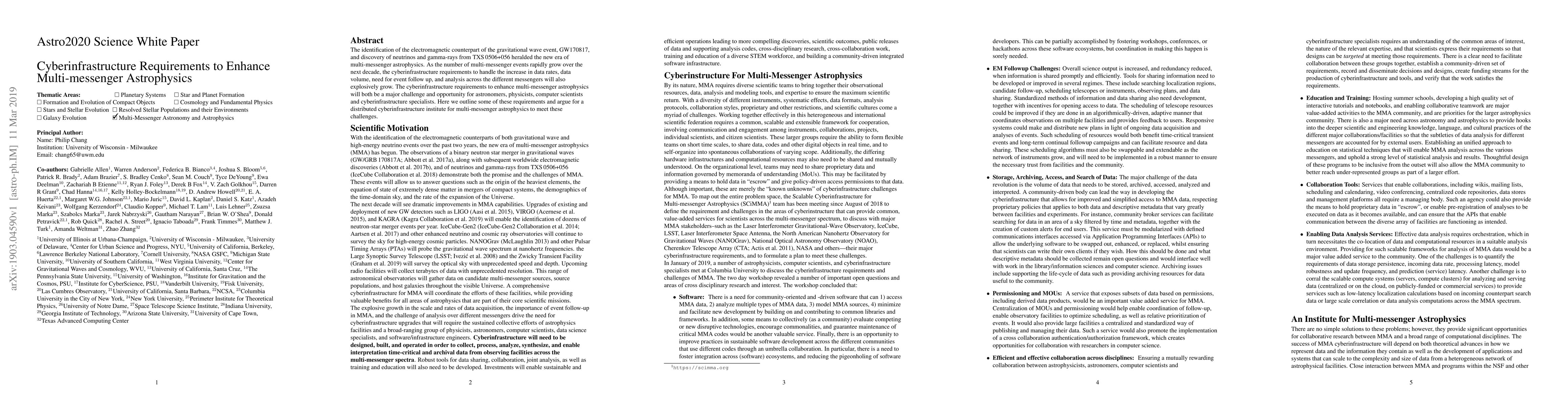 This paper discusses the growing cyberinfrastructure needs to support the expanding field of multi-messenger astrophysics, driven by the increasing number of simultaneous gravitational wave, electromagnetic, neutrino, and gamma-ray events. It proposes the establishment of a distributed cyberinfrastructure institute to address the challenges of data management and analysis.