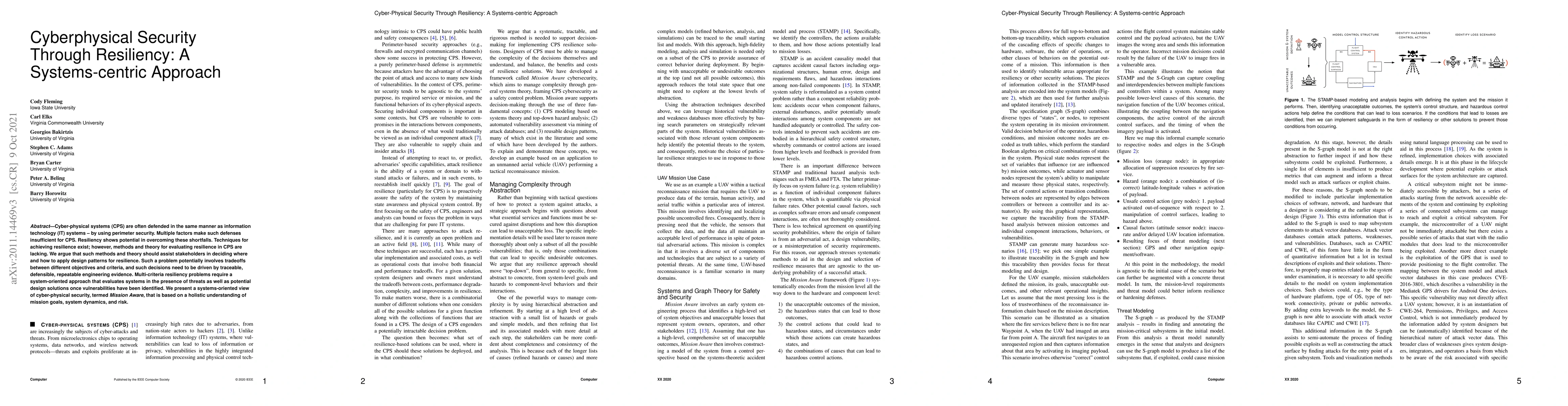 This paper proposes a systems-centric approach to cyber-physical security through resiliency, arguing that traditional perimeter defenses are insufficient. It introduces a framework called Mission Aware to evaluate and apply resilience design patterns, emphasizing the need for traceable, repeatable evidence in multi-criteria decision-making.
