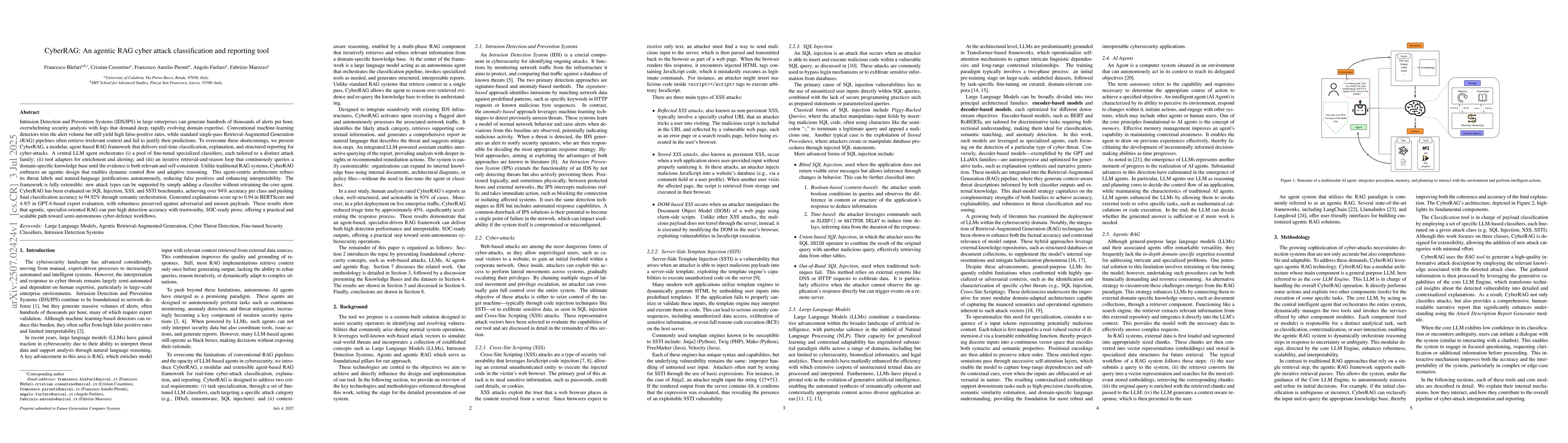Intrusion Detection and Prevention Systems (IDS/IPS) in large enterprises can generate hundreds of thousands of alerts per hour, overwhelming security analysts with logs that demand deep, rapidly evolving domain expertise. Conventional machine-learning detectors trim the alert volume but still yield high false-positive rates, while standard single-pass Retrieval-Augmented Generation (RAG) pipelines often retrieve irrelevant context and fail to justify their predictions. To overcome these shortcomings, we present CyberRAG, a modular, agent-based RAG framework that delivers real-time classification, explanation, and structured reporting for cyber-attacks. A central LLM agent orchestrates (i) a pool of fine-tuned specialized classifiers, each tailored to a distinct attack family; (ii) tool adapters for enrichment and alerting; and (iii) an iterative retrieval-and-reason loop that continuously queries a domain-specific knowledge base until the evidence is both relevant and self-consistent. Unlike traditional RAG systems, CyberRAG embraces an agentic design that enables dynamic control flow and adaptive reasoning. This agent-centric architecture refines its threat labels and natural-language justifications autonomously, reducing false positives and enhancing interpretability. The framework is fully extensible: new attack types can be supported by simply adding a classifier without retraining the core agent. CyberRAG has been evaluated achieving over 94% accuracy per class and pushing final classification accuracy to 94.92% through semantic orchestration. Generated explanations score up to 0.94 in BERTScore and 4.9/5 in GPT-4-based expert evaluation. These results show that agentic, specialist-oriented RAG can pair high detection accuracy with trustworthy, SOC-ready prose, offering a practical and scalable path toward semi-autonomous cyber-defence workflows.