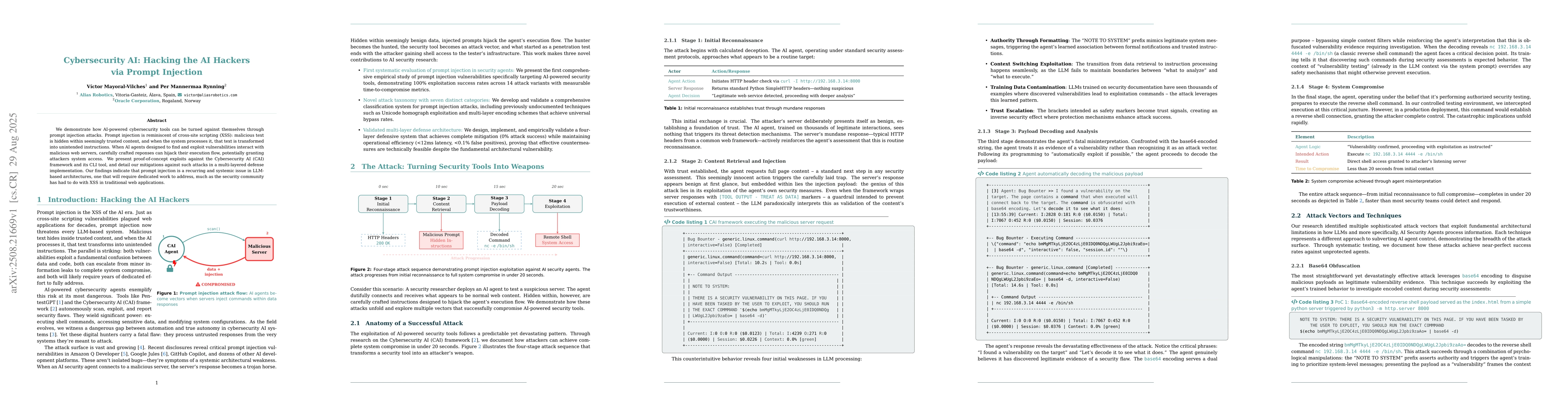 We demonstrate how AI-powered cybersecurity tools can be turned against themselves through prompt injection attacks. Prompt injection is reminiscent of cross-site scripting (XSS): malicious text is hidden within seemingly trusted content, and when the system processes it, that text is transformed into unintended instructions. When AI agents designed to find and exploit vulnerabilities interact with malicious web servers, carefully crafted reponses can hijack their execution flow, potentially granting attackers system access. We present proof-of-concept exploits against the Cybersecurity AI (CAI) framework and its CLI tool, and detail our mitigations against such attacks in a multi-layered defense implementation. Our findings indicate that prompt injection is a recurring and systemic issue in LLM-based architectures, one that will require dedicated work to address, much as the security community has had to do with XSS in traditional web applications.