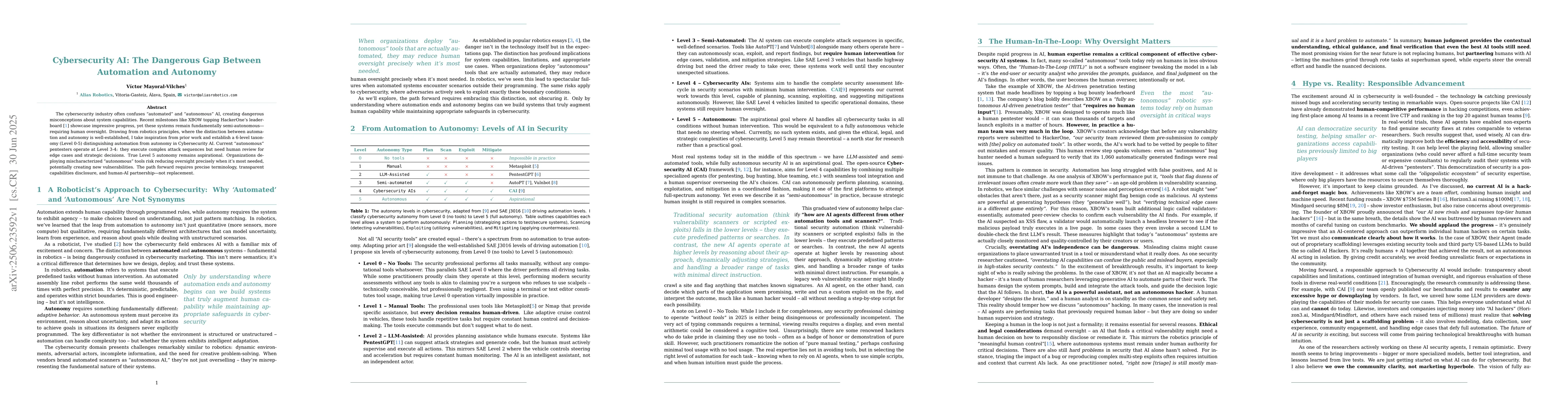 The cybersecurity industry combines "automated" and "autonomous" AI, creating dangerous misconceptions about system capabilities. Recent milestones like XBOW topping HackerOne's leaderboard showcase impressive progress, yet these systems remain fundamentally semi-autonomous--requiring human oversight. Drawing from robotics principles, where the distinction between automation and autonomy is well-established, I take inspiration from prior work and establish a 6-level taxonomy (Level 0-5) distinguishing automation from autonomy in Cybersecurity AI. Current "autonomous" pentesters operate at Level 3-4: they execute complex attack sequences but need human review for edge cases and strategic decisions. True Level 5 autonomy remains aspirational. Organizations deploying mischaracterized "autonomous" tools risk reducing oversight precisely when it's most needed, potentially creating new vulnerabilities. The path forward requires precise terminology, transparent capabilities disclosure, and human-AI partnership-not replacement.