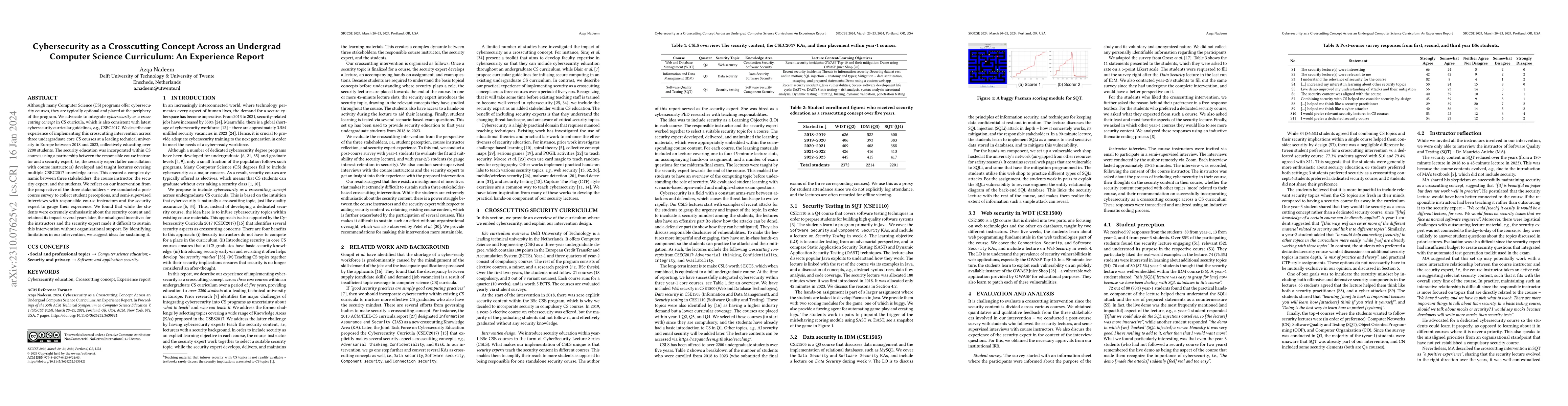 This paper reports on integrating cybersecurity as a crosscutting concept across three undergraduate CS courses, finding student enthusiasm but highlighting instructor and security expert misalignment as sustainability challenges. The study suggests organizational support is needed to maintain this intervention.