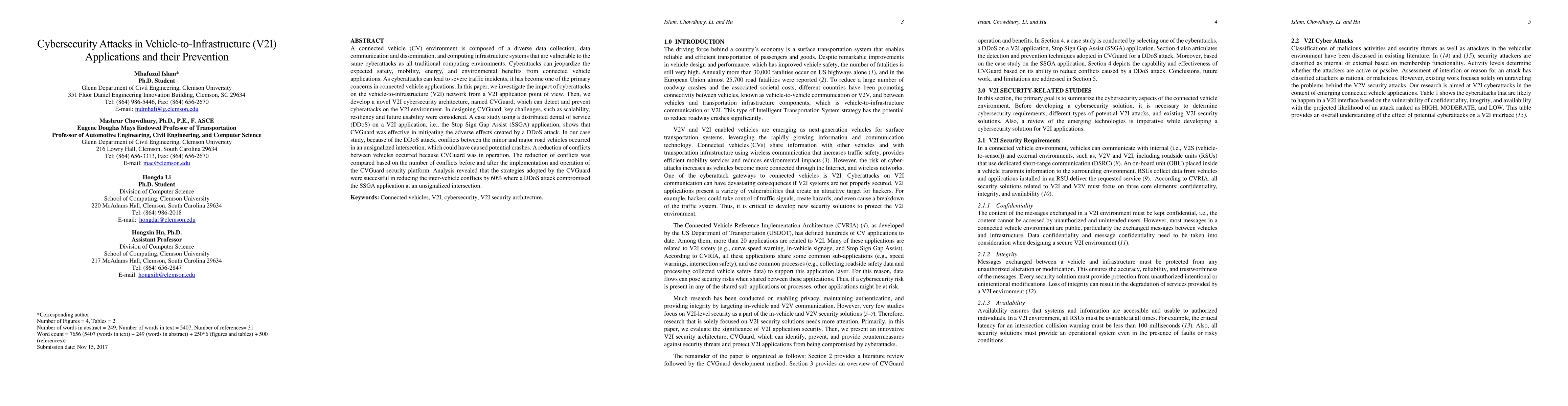 This paper investigates the impact of cyberattacks on vehicle-to-infrastructure (V2I) networks and proposes a novel cybersecurity architecture, CVGuard, to detect and prevent such attacks. The study demonstrates CVGuard's effectiveness in reducing inter-vehicle conflicts by 60% during a simulated DDoS attack on the Stop Sign Gap Assist application.