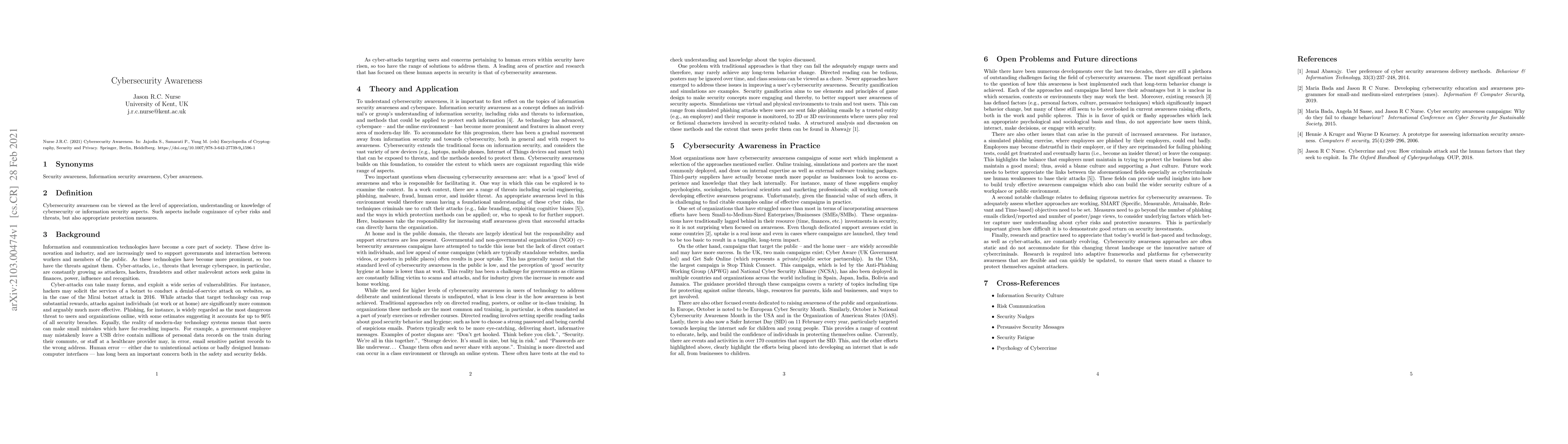 Summary: This paper explores cybersecurity awareness as the understanding and appreciation of cybersecurity risks and threats, alongside the knowledge of effective protection measures. It emphasizes the importance of awareness in mitigating cyber threats.