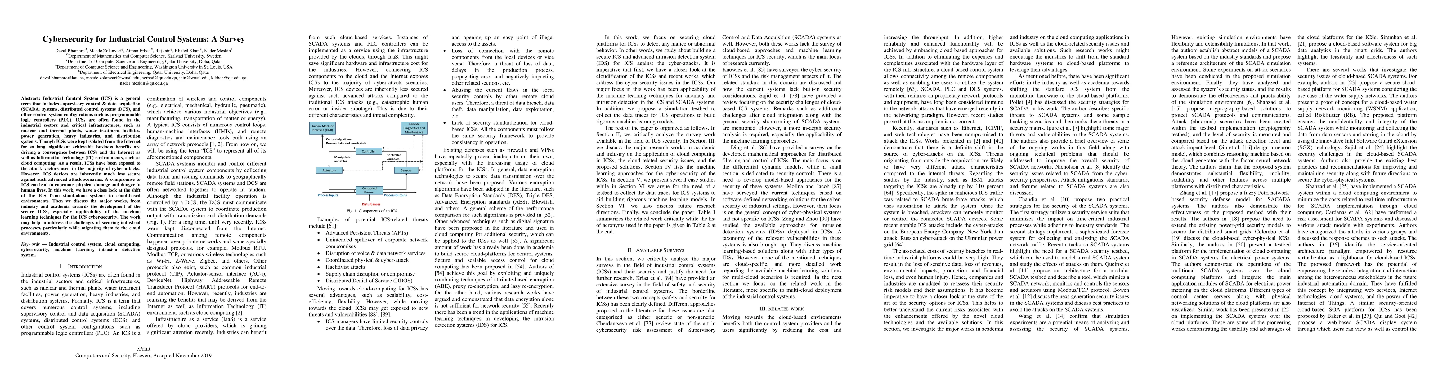 This paper surveys the cybersecurity challenges of Industrial Control Systems (ICS), including SCADA and PLCs, as they transition from isolated to cloud-based environments. It highlights the vulnerabilities of ICSs and explores machine learning techniques to enhance security in these critical infrastructures.