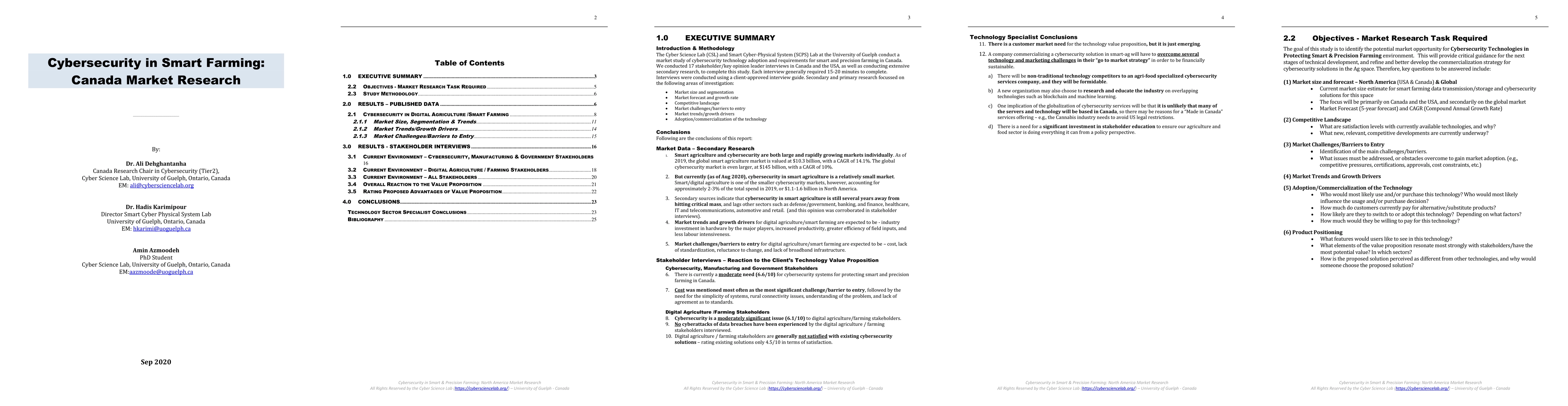 The Cyber Science Lab (CSL) and Smart Cyber-Physical System (SCPS) Lab at the University of Guelph conduct a market study of cybersecurity technology adoption and requirements for smart and precision farming in Canada. We conducted 17 stakeholder/key opinion leader interviews in Canada and the USA, as well as conducting extensive secondary research, to complete this study. Each interview generally required 15-20 minutes to complete. Interviews were conducted using a client-approved interview guide. Secondary and primary research focussed on the following areas of investigation: Market size and segmentation Market forecast and growth rate Competitive landscape Market challenges/barriers to entry Market trends/growth drivers Adoption/commercialization of the technology