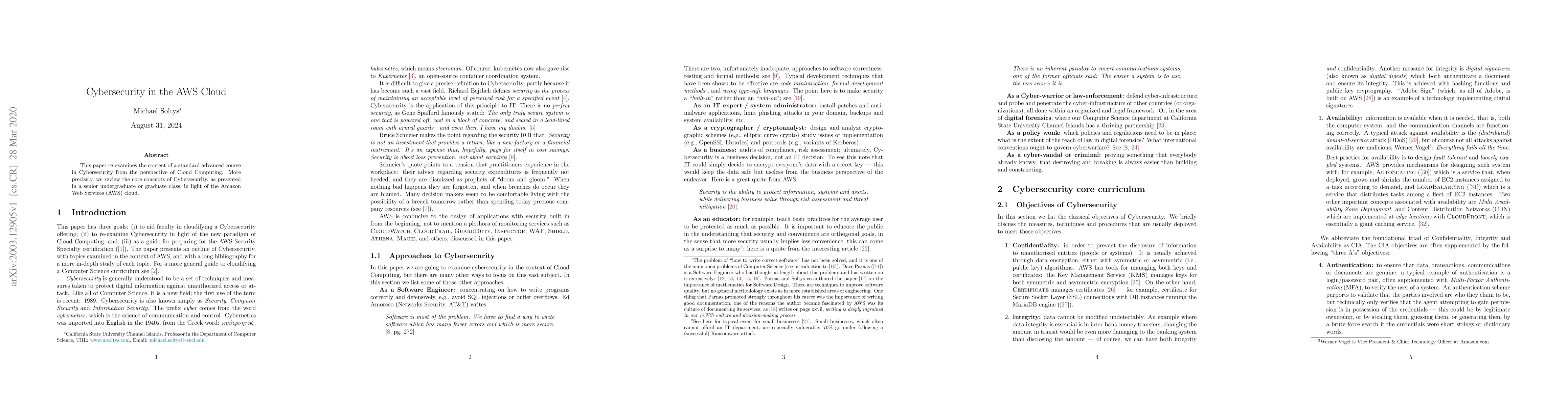 This paper revisits standard cybersecurity course material, focusing on core concepts, and adapts them to the context of Amazon Web Services (AWS) cloud computing. It aims to integrate cloud-specific security challenges and solutions into the curriculum.