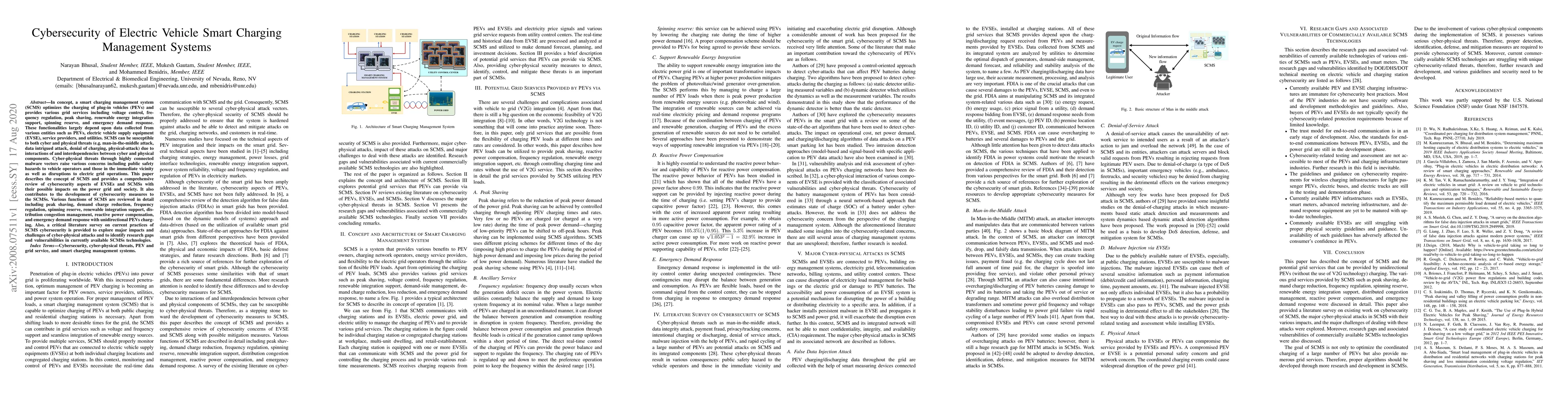 This paper reviews the cybersecurity of smart charging management systems (SCMS) for electric vehicles, highlighting vulnerabilities and threats from cyber-physical attacks. It examines various SCMS functions and proposes cybersecurity measures to mitigate risks and enhance grid stability and public safety.