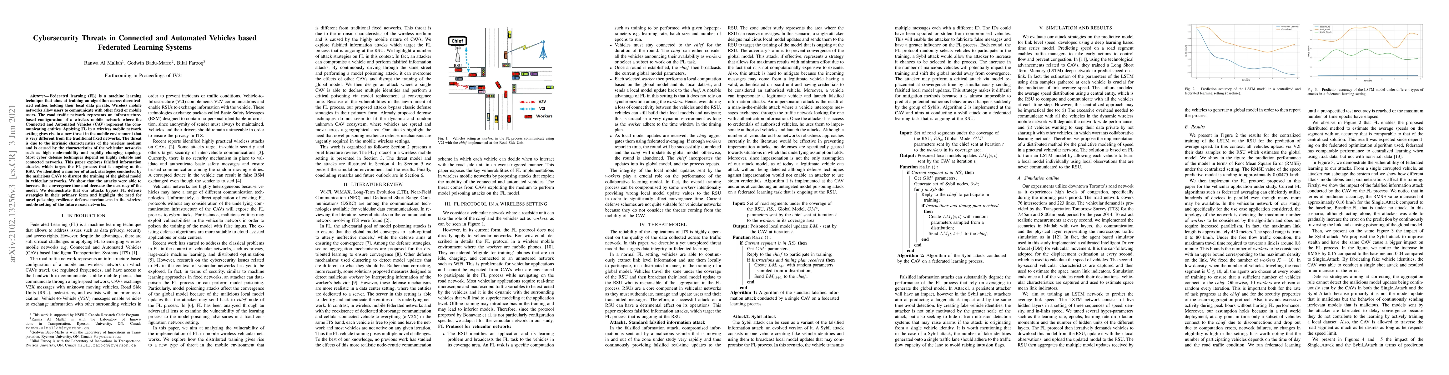 This paper investigates cybersecurity threats in Federated Learning systems used in Connected and Automated Vehicles (CAVs), identifying falsified information attacks that disrupt the FL process at roadside units (RSU). The attacks increase convergence time and decrease model accuracy, highlighting the need for new defense mechanisms against poisoning in wireless mobile networks.