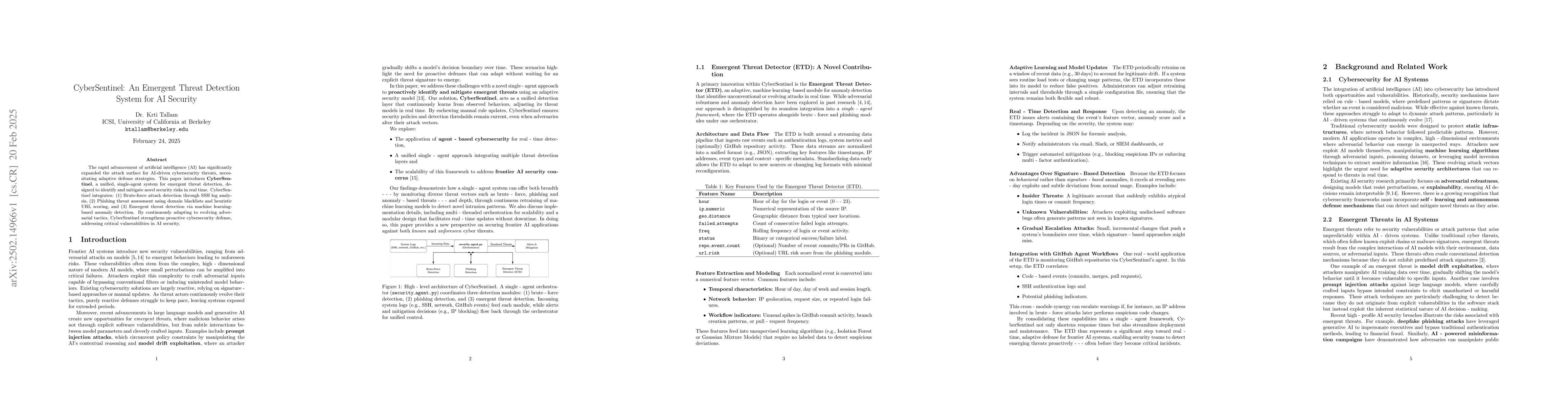 CyberSentinel is a real-time emergent threat detection system that integrates SSH log analysis for brute-force attacks, phishing threat assessment using blacklists and heuristics, and machine learning for anomaly detection, aiming to adaptively counter evolving cybersecurity threats in AI environments.