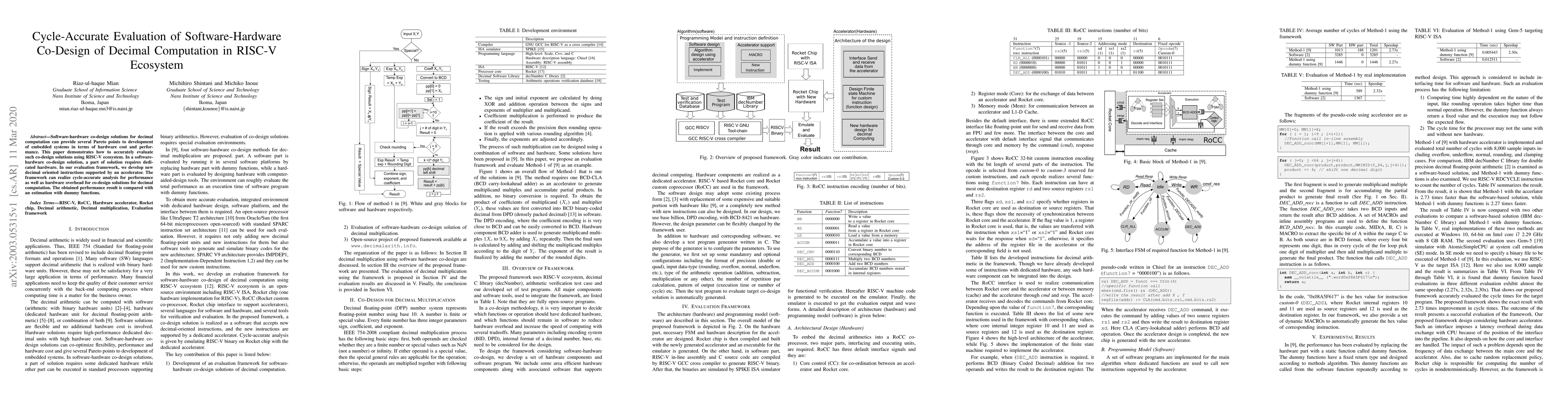 Software-hardware co-design solutions for decimal computation can provide several Pareto points to development of embedded systems in terms of hardware cost and performance. This paper demonstrates how to accurately evaluate such co-design solutions using RISC-V ecosystem. In a software-hardware co-design solution, a part of solution requires dedicated hardware. In our evaluation framework, we develop new decimal oriented instructions supported by an accelerator. The framework can realize cycle-accurate analysis for performance as well as hardware overhead for co-design solutions for decimal computation. The obtained performance result is compared with an estimation with dummy functions.
