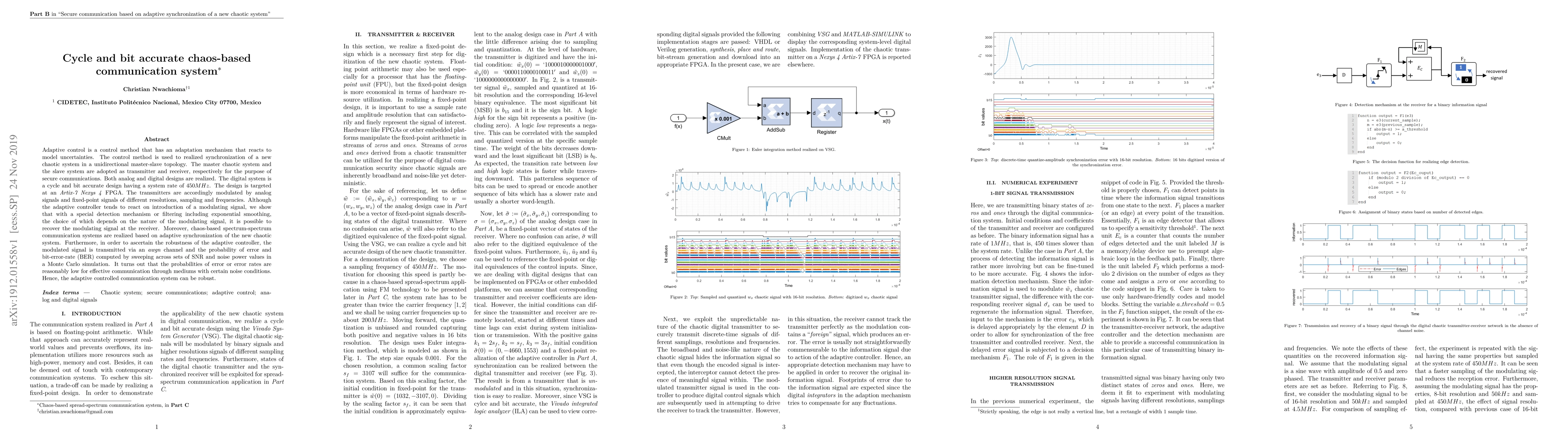 This paper presents a cycle and bit accurate chaos-based communication system utilizing adaptive control for synchronization in a master-slave topology. The system demonstrates secure communication through both analog and digital designs, with a digital design operating at 450MHz on an Artix-7 Nexys 4 FPGA, showing robustness against noise through Monte Carlo simulations.