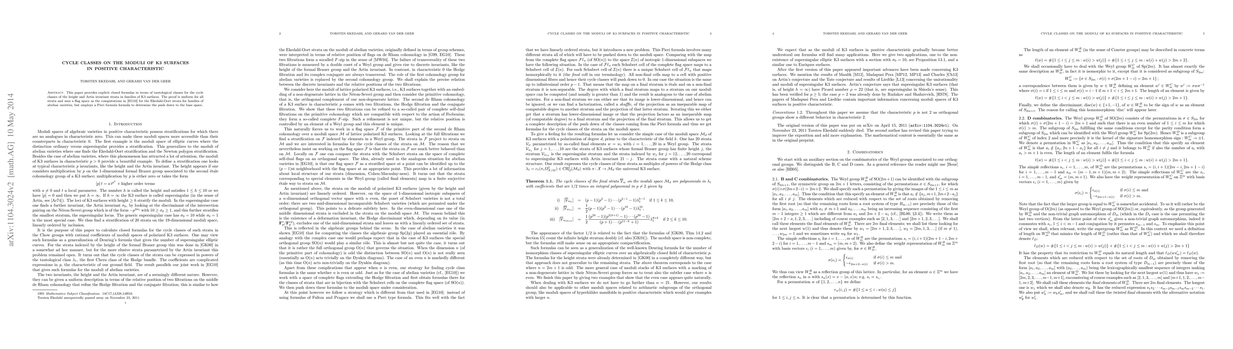 This paper provides explicit closed formulas in terms of tautological classes for the cycle classes of the height and Artin invariant strata in families of K3 surfaces. The proof is uniform for all strata and uses a flag space as the computations in [arXiv:math/0412272] for the Ekedahl-Oort strata for families of abelian varieties, but employs a Pieri formula formula to determine the push down to the base space.